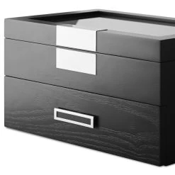 Constructed of dense fiberboard, this watch box is made to keep your timepieces free of moisture, dust, and impact marks of any kind. Its stunning high-grade black veneer finish makes it a handsome addition to your display cabinet.