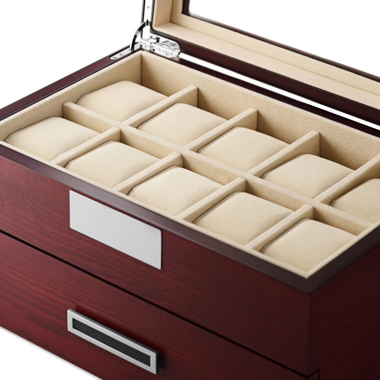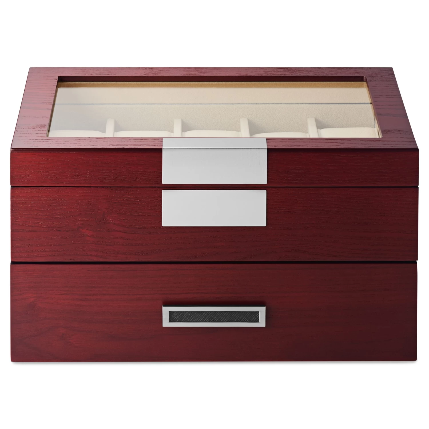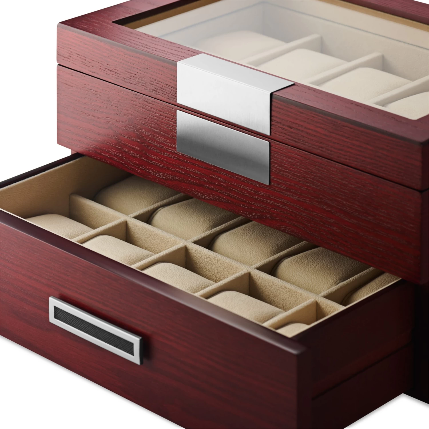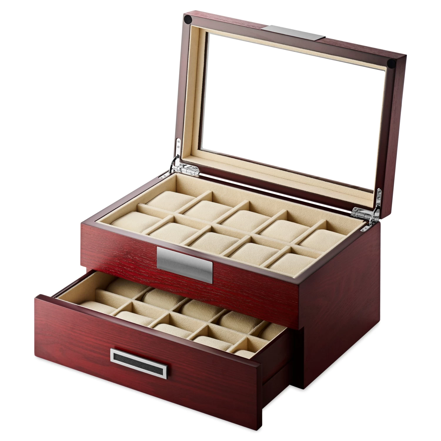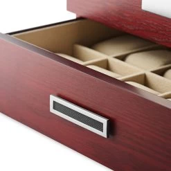 The lid features a glass display window and high-quality quadrant jewelry box hinges. At the bottom, a discrete pull-out drawer offers storage space for 10 more watches.