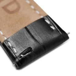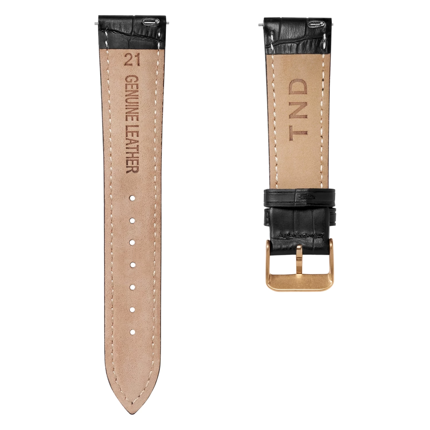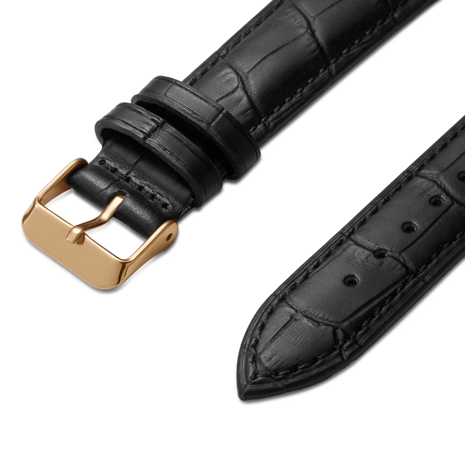 Fashioned from top-grain leather with an embossed crocodile skin pattern. Fits securely with a stainless steel buckle.