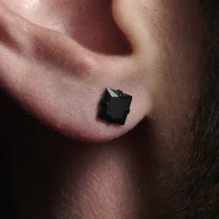 This bold earring for men features a modern black on black design. Crafted with black steel and quartz.