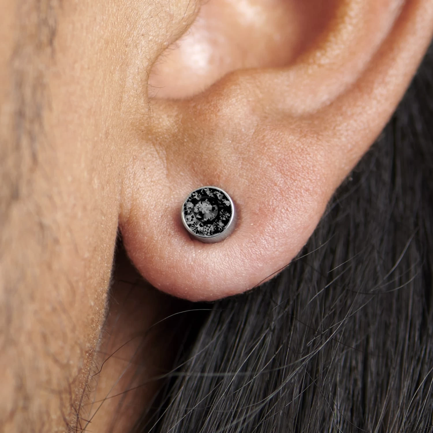 A bevy of black crystals festoon this circular earring. Fastens to your earlobe thanks to a strong built-in magnet. Price includes a single men’s earring only. Made with hypoallergenic steel.