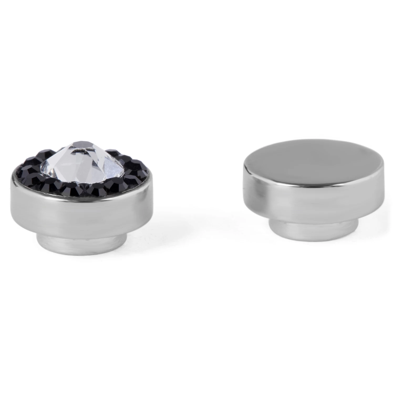 A solitary clear crystal is surrounded by tiny black ones. Stones are set in nickel-free, hypoallergenic steel. The built-in magnet makes a piercing unnecessary. Price includes one men’s earring only.