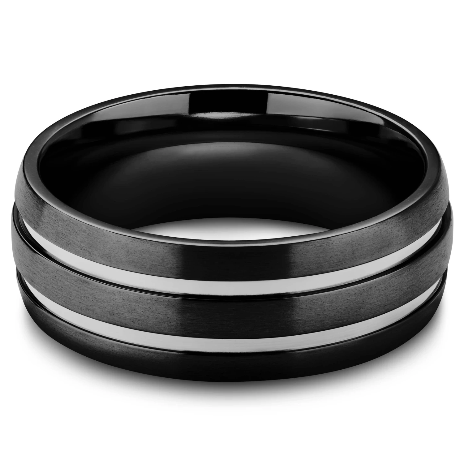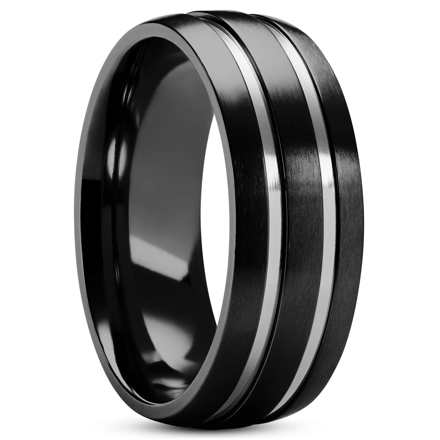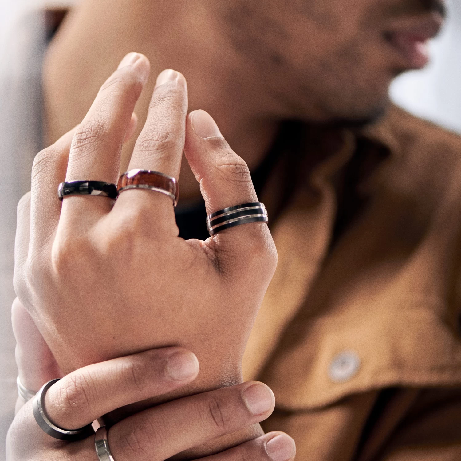 The black color is produced using a method called physical vapor deposition. PVD involves superheating titanium nitrate to a plasma state and shooting it at the ring, creating a thin ceramic layer that’s attached to the surface at the molecular level. It won’t flake, is super durable, and scratch resistant.