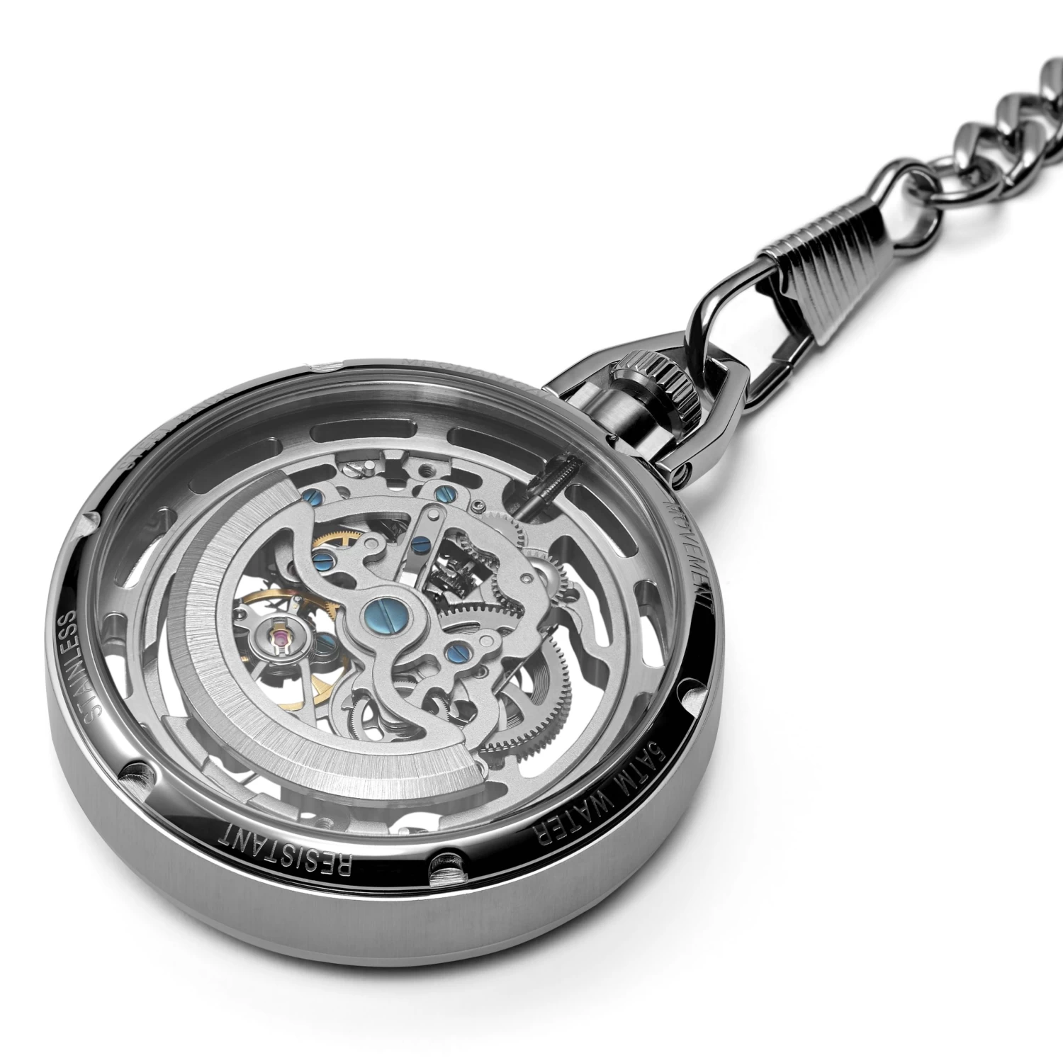 Why hide artistry? Carefully designed with a skeleton dial and exhibition case back, this pocket watch lets you see the time and marvel at the inner workings at a glance, instead of having to flip open a bulky cover.
