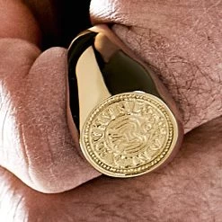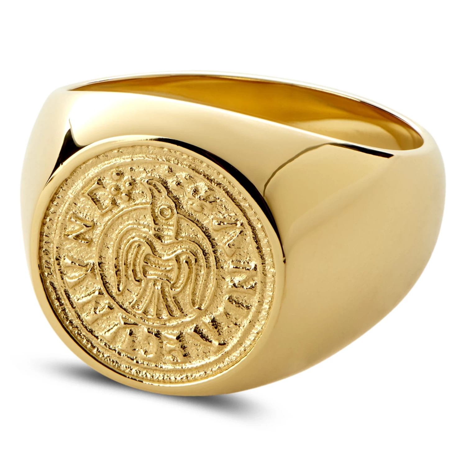 Polished to a high shine, this men’s signet ring is made of surgical-grade stainless steel and PVD-coated gold tone. Titanium nitride is fused with the metal’s surface at the molecular level, resulting in a brilliant surface that’s both scratch and tarnish resistant and will neither fade nor flake.