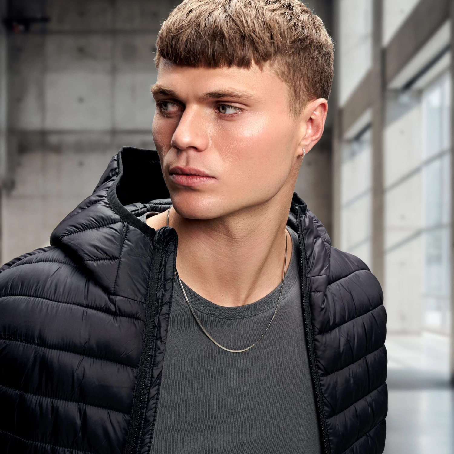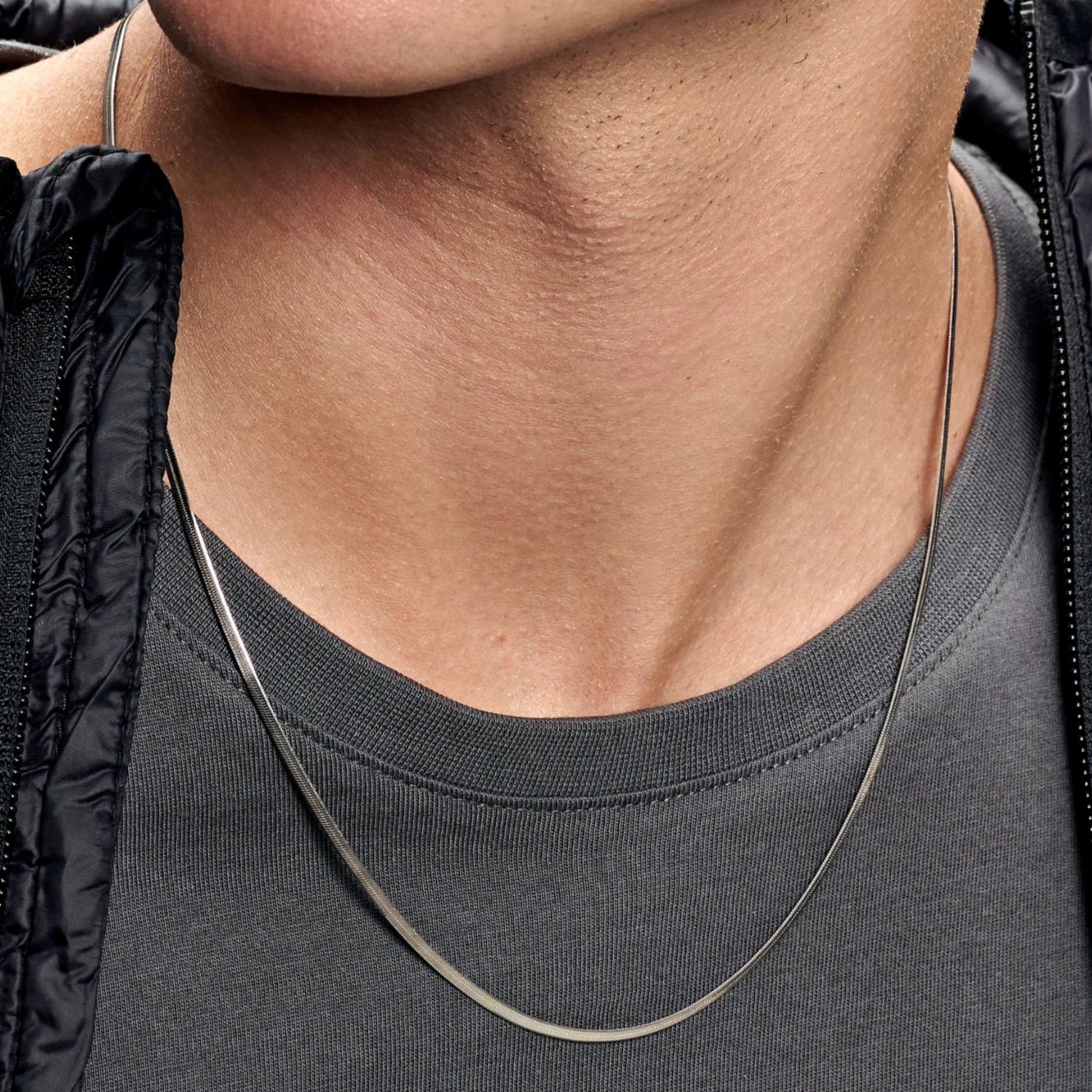 The intricate herringbone design features an interwoven pattern of flat and polished links that create a captivating yet understated visual appeal. Finished with a radiant rhodium plating for enhanced durability and tarnish resistance, this exceptional sterling silver necklace for men is the epitome of style and sophistication.