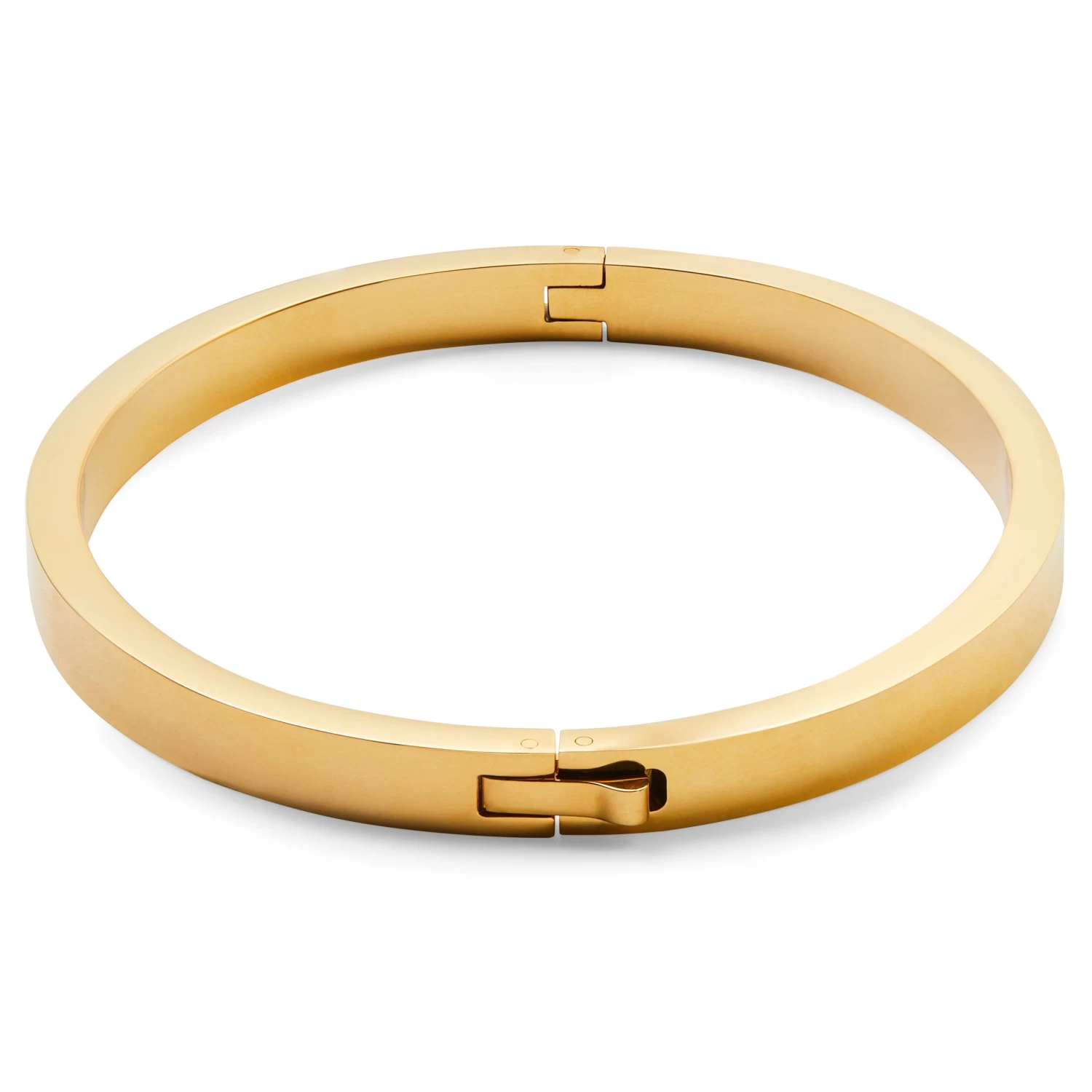This hinged men’s bangle bracelet cuff is made of surgical-grade stainless steel and coated gold tone for an elegant masculine look. Locks with a strong, easy-to-use clasp that makes accidental opening virtually impossible.