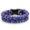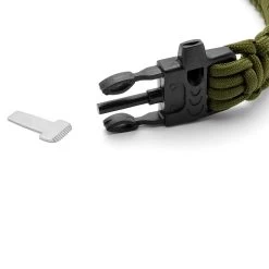 Green survival bracelet has a fire starter built in, plus a whistle in the lock. Sturdy black buckle. Comes in a black gift bag.