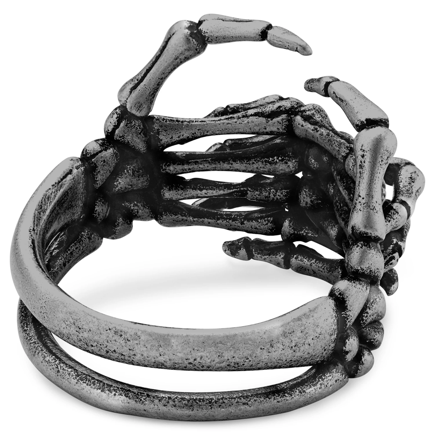 This men’s ring features a pair of skeleton hands linked together. At rest in a grave or folded in thought? You write the story.