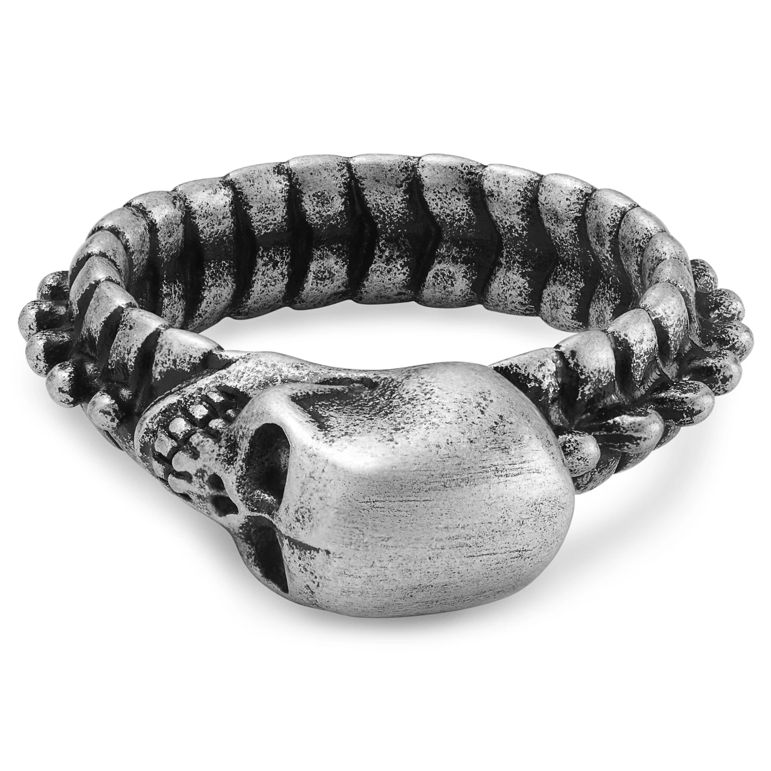 This men’s ring features a bold skull at the centre of the ring, in a blackened silver-tone finish that brings all the fierce details into sharp focus. Comes with a unique band in the shape of a spine with bony knobs and a bumpy texture. Crafted from surgical-grade stainless steel for durability and tarnish resistance.