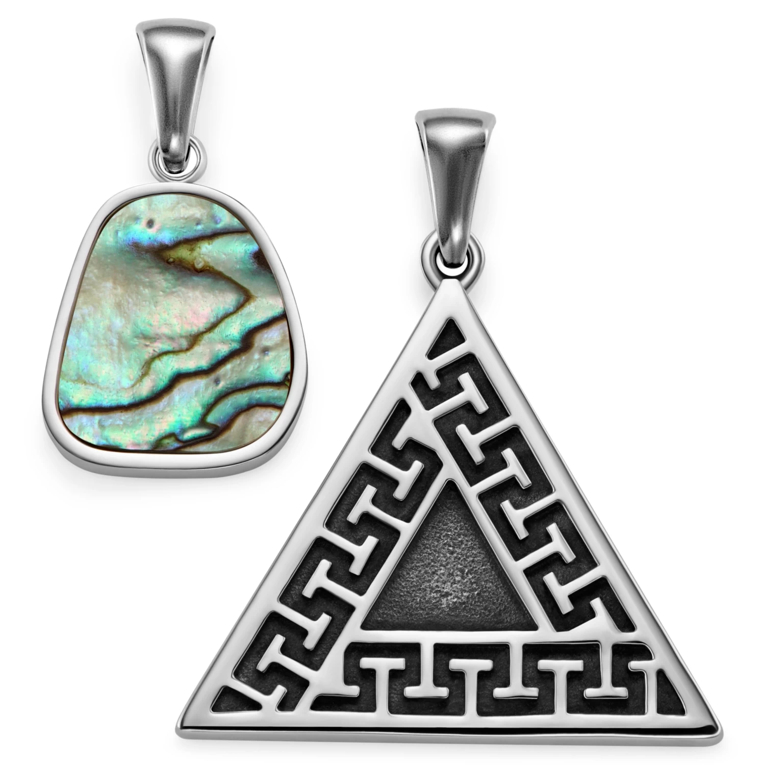 The sharp, geometric triangle pendant carries the iconic meander motif, which we can trace back to the ancient Greeks and Romans. The design stands out against the polished silver tone, making for an eye-catching pendant to dangle from your necklace.