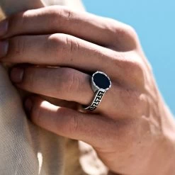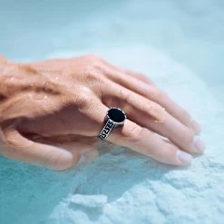 The Atlantis collection is inspired by ancient mythology and folklore, with natural stones as the focal point. The deep black onyx stone on this men’s ring is set in surgical-grade stainless steel, ensuring it’s well-protected from damage. The textured edge around the onyx and the motif inspired by classical architecture give this ring a vintage and timeless look.