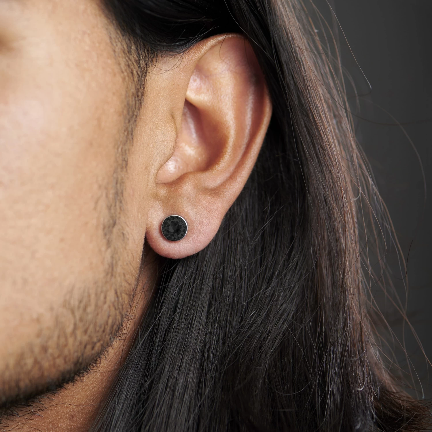 An array of black crystals encrust a nickel-free steel earring. Features a built-in magnet, so no piercing needed to wear it. Price includes a single men’s earring only.