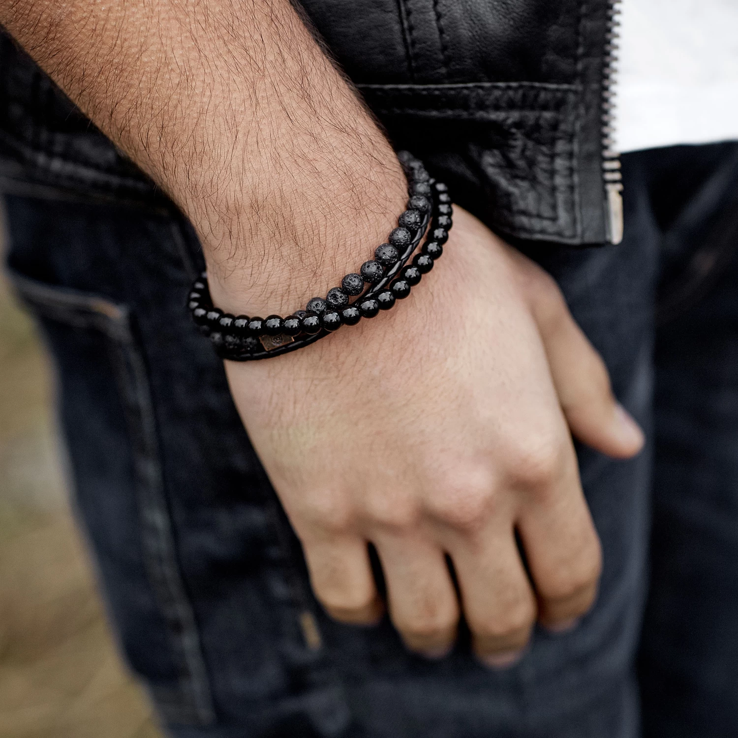 Danish brand Lucleon is at it again with this super stylish trio. Features 3 black bracelets crafted from various materials, including lava beads, leather, and steel.