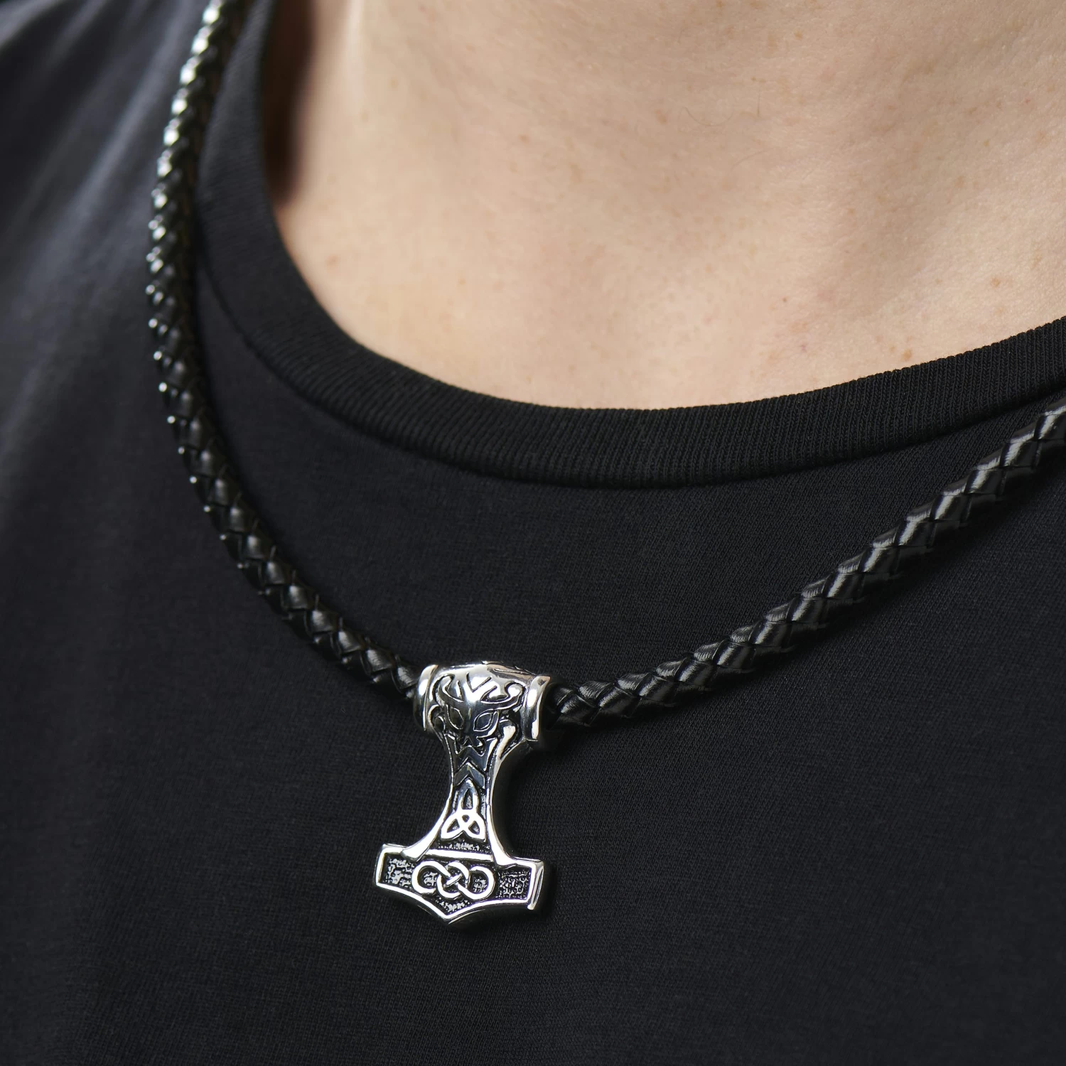 Features a double-sided pendant crafted from surgical steel with Celtic motifs. Braided genuine leather cord feels great against skin. Lobster claw fastening is easier to use than catching real lobsters.