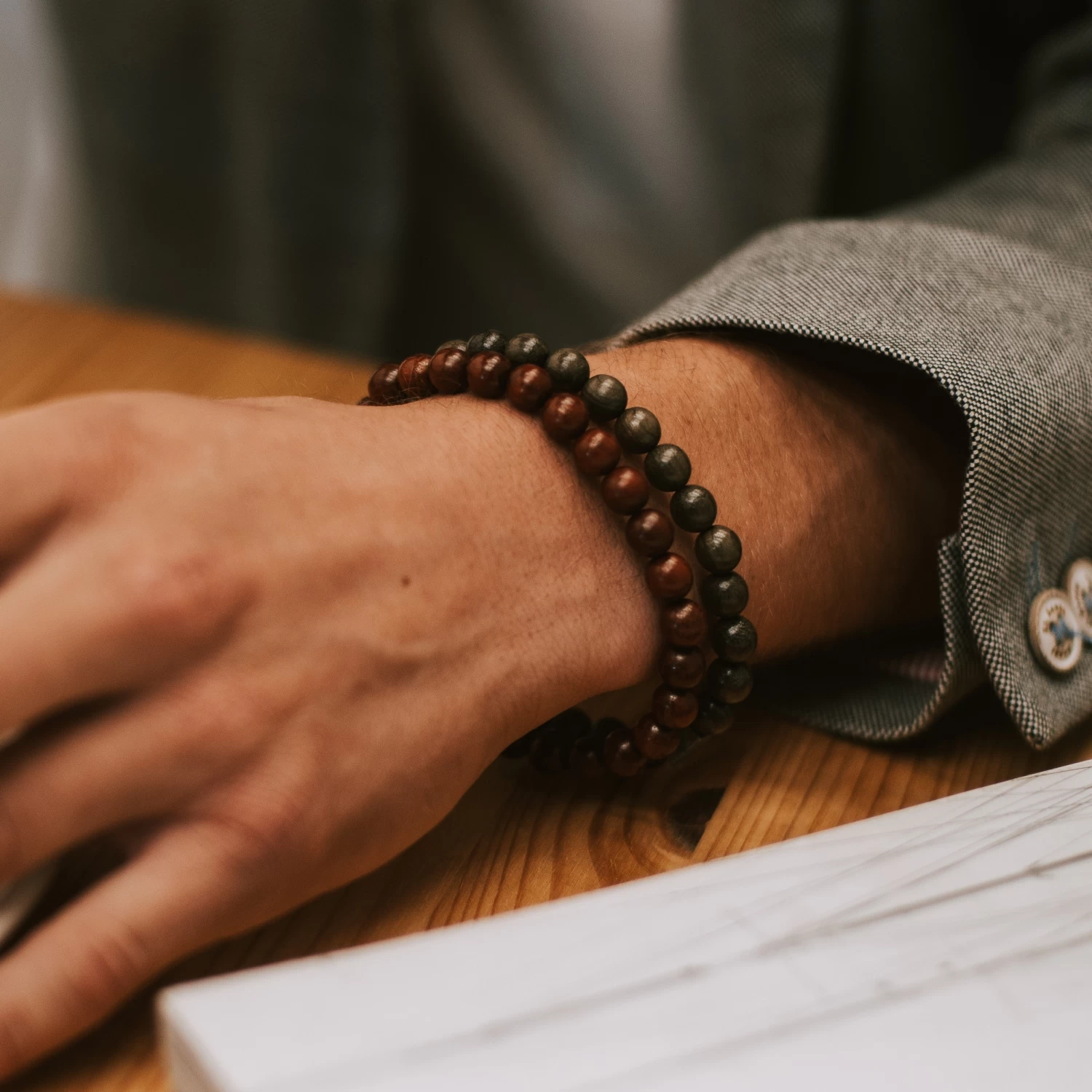 This pear tree wood and Adamas stone bracelet duo features a neutral color scheme. Looks great with any casual look. Wear separately or as a pair.