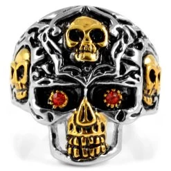 A silver- and gold-toned skull features smaller inlaid skulls as well as menacing red cubic zirconia eyes. A real attention grabber!!