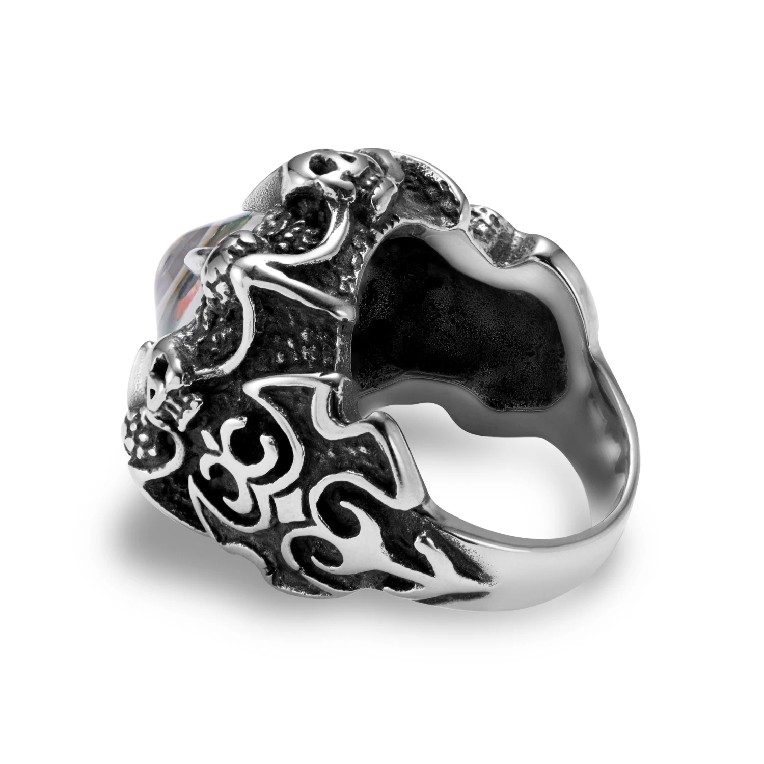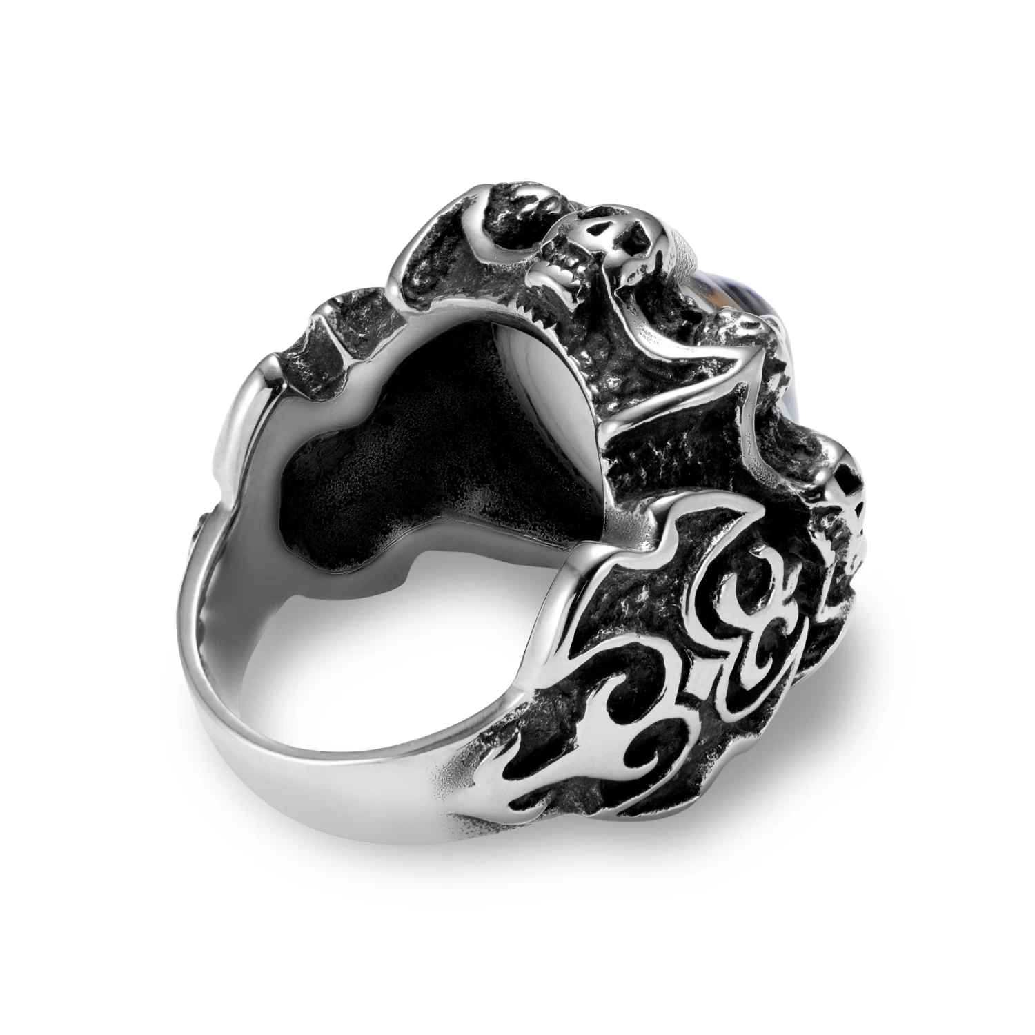 Channel your inner warrior and make a bold style statement with this stylish metal ring. The silver-colored ring band has a one-of-a-kind raised design, featuring skulls and bohemian symbols. The central eye feature is encased in a claw fitting.