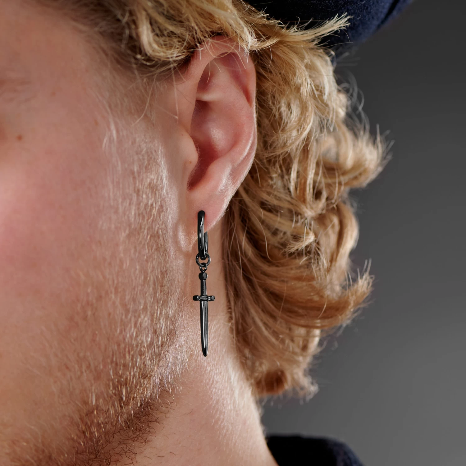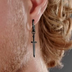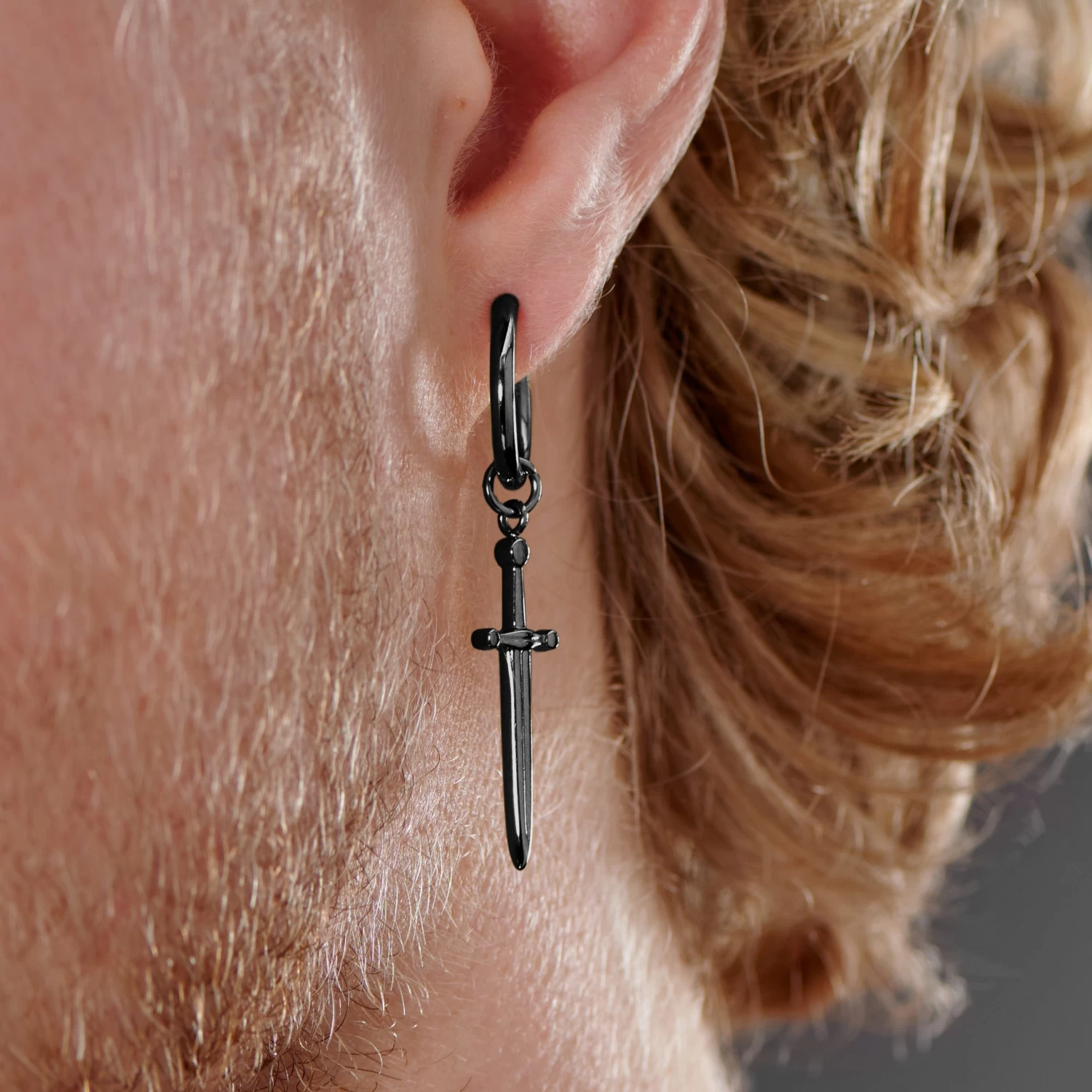 Arm your ear with this men’s drop hoop earring that comes with a dangling sword charm.