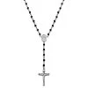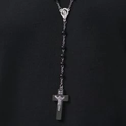 Praying Mary figure joins the rosary beads together at the bottom of the necklace. A wooden crucifix hangs on a short extension, reflecting Jesus on the cross. Necklace and pendant are polished metal. Rosary beads are shiny black wood.