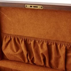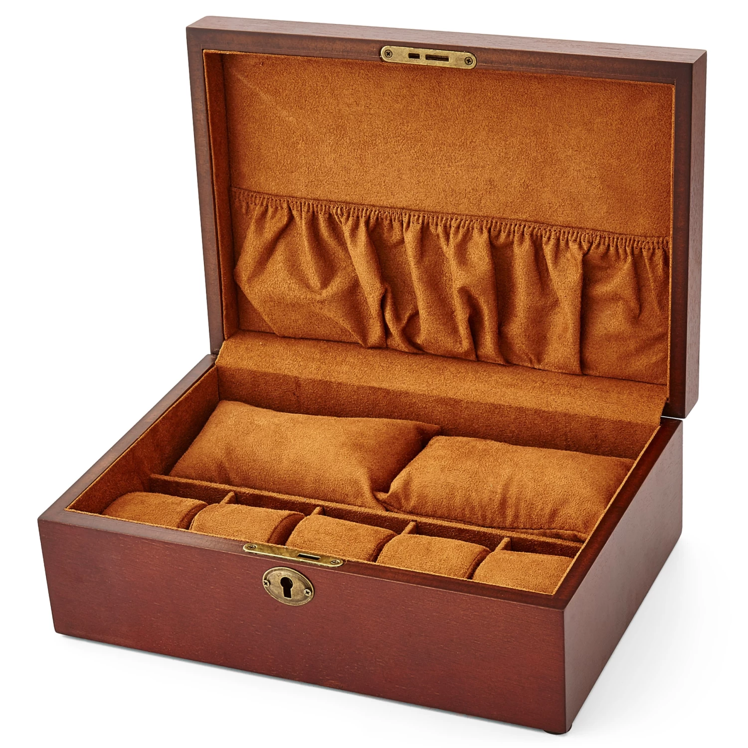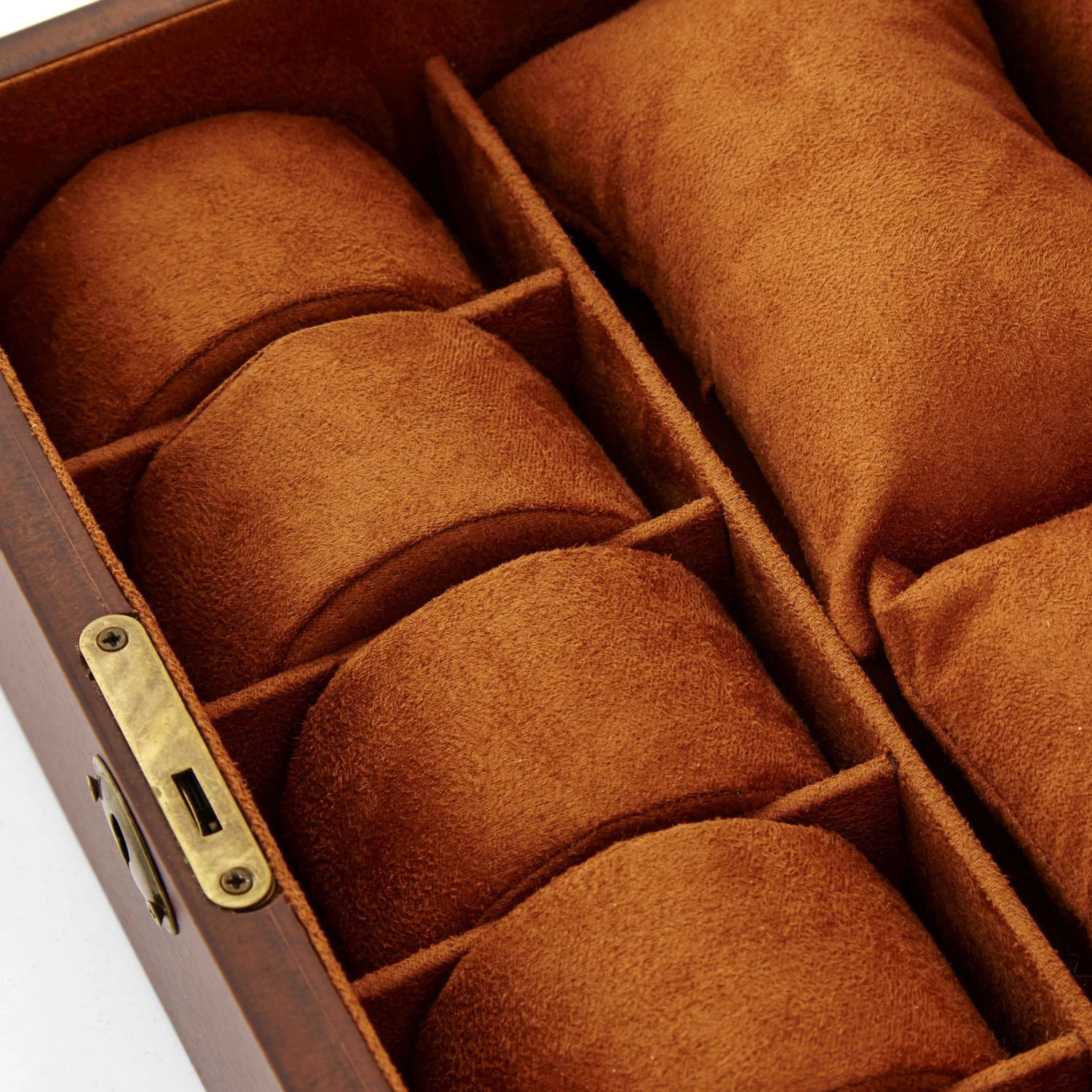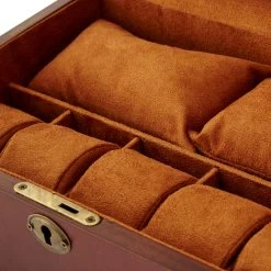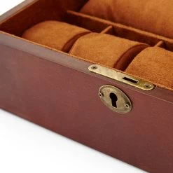 The interior is lined with soft felt in a darker shade of brown. Five individual compartments hold your watches. Two small pouches can house other valuables and a pocket that provides more storage.