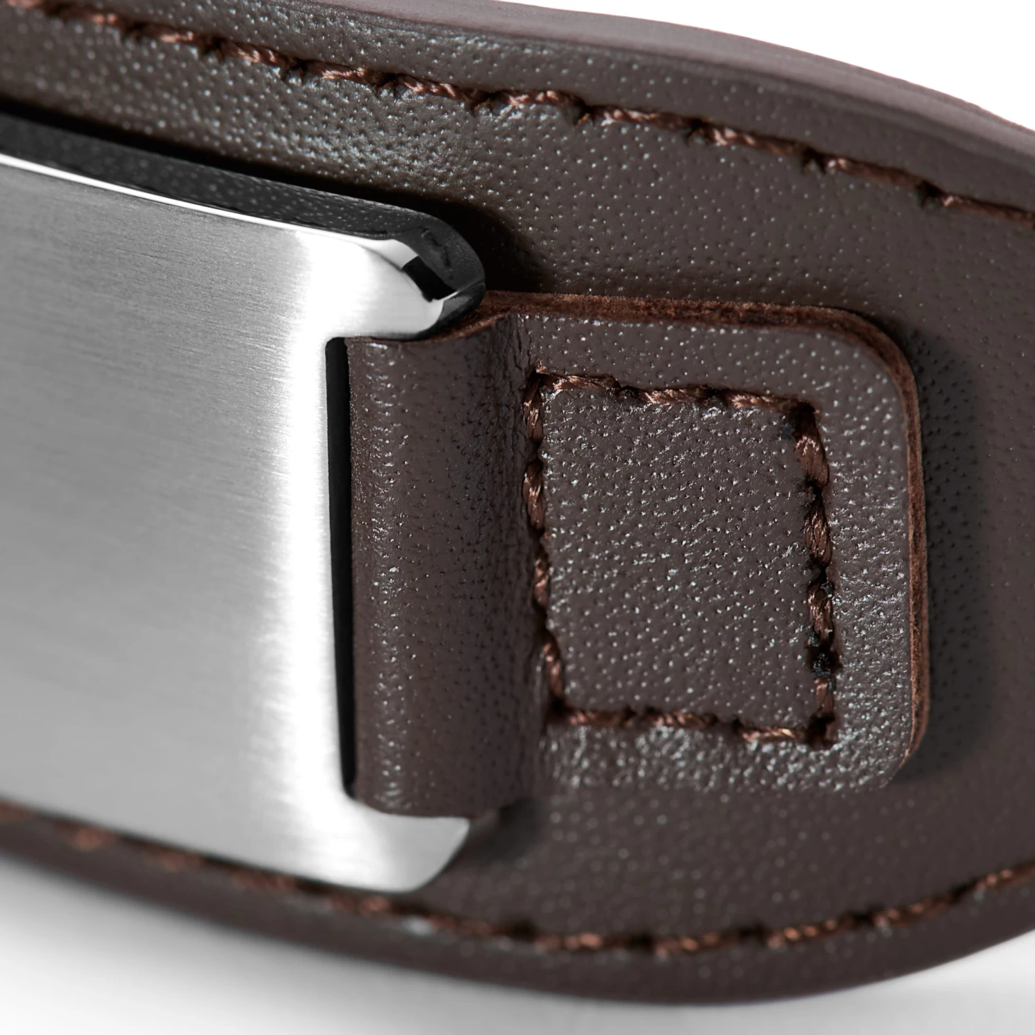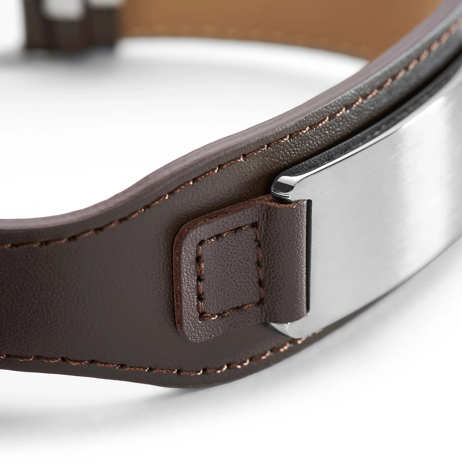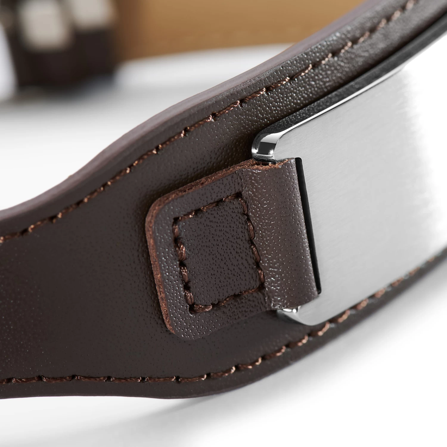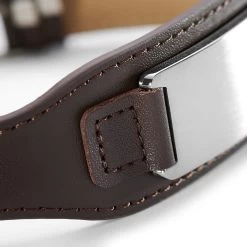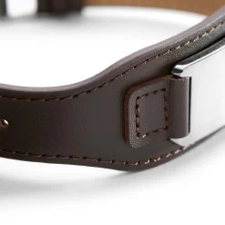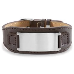This wide brown leather bracelet boasts a surgical-grade stainless steel plate that’s practically shouting for an engraving.