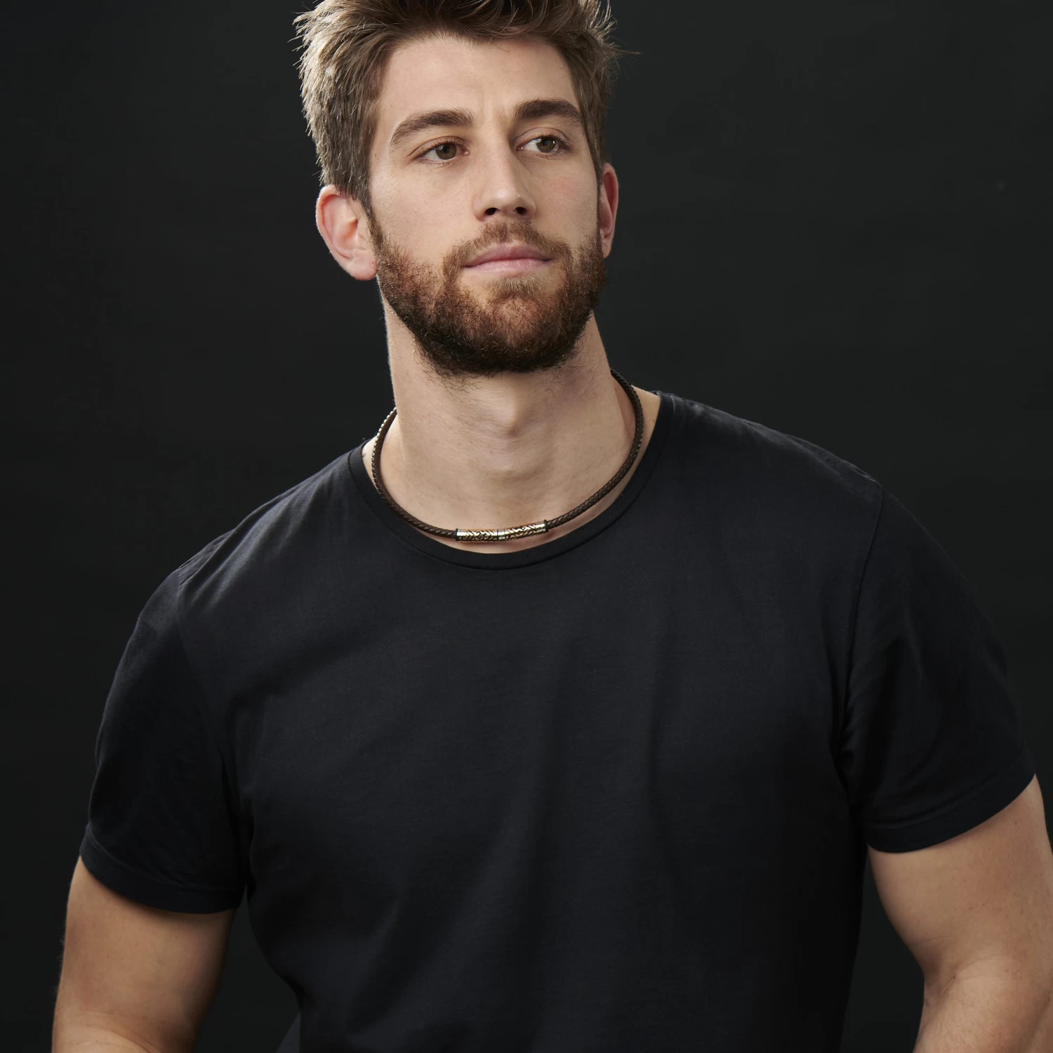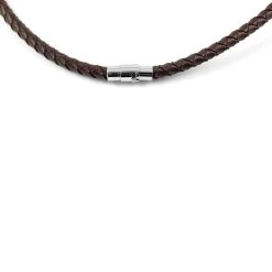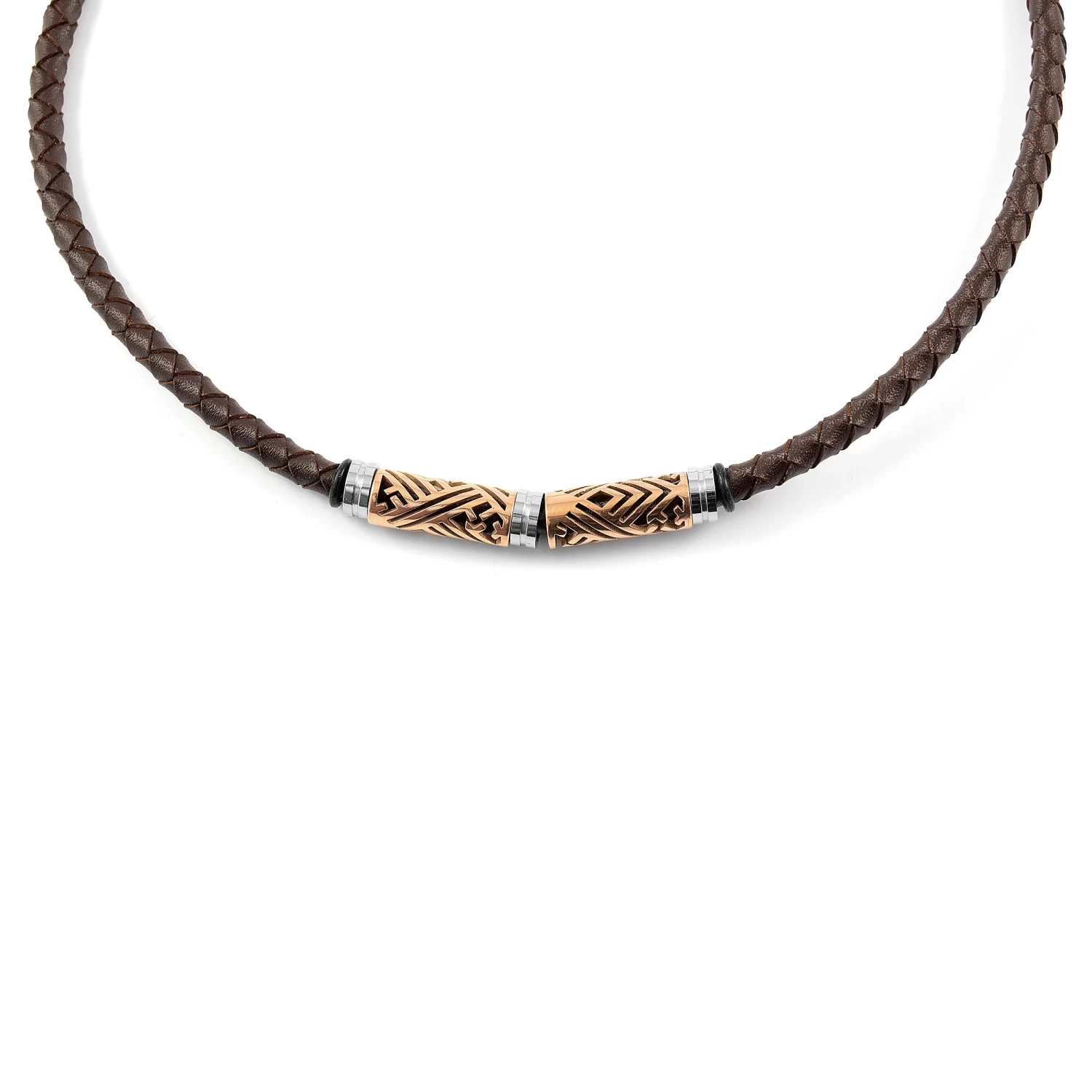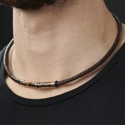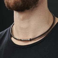 Made from braided brown leather, this stunning men’s necklace features beautiful gold-toned beads with funky geometric cutouts. Finished with a secure magnetic rotation lock.