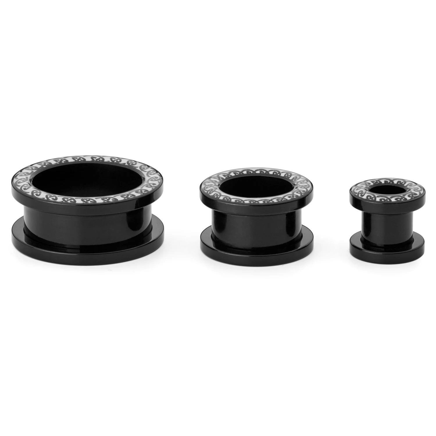Celtic circles have their meaning rooted in unity and eternity. This double flare flesh tunnel is crafted in black acrylic with this iconic pattern on the rim.