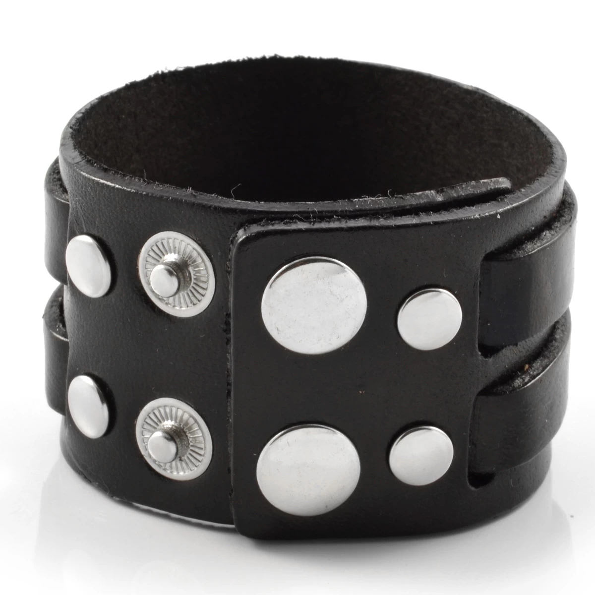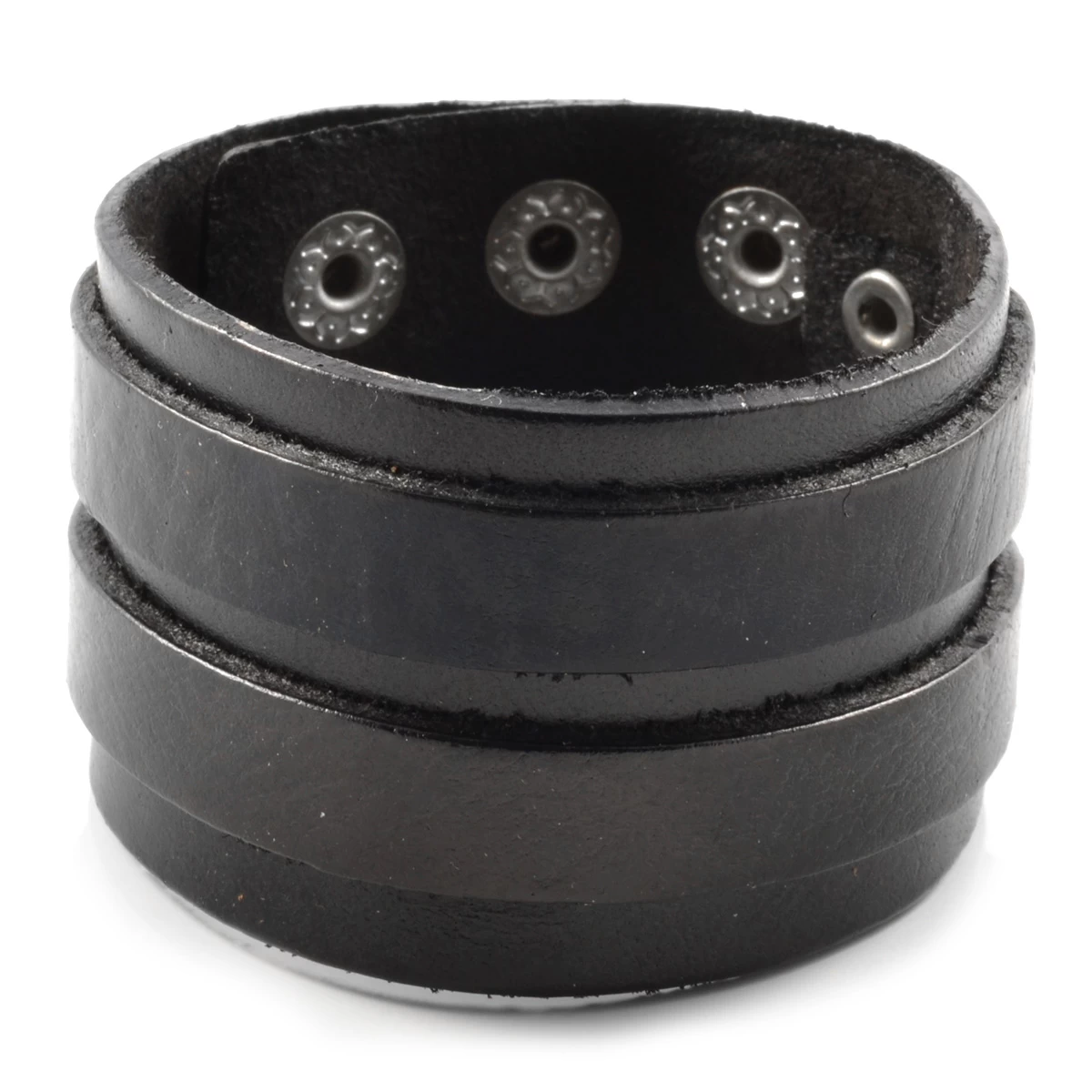 This wide black cuff is accented with two identical leather strips wrapped around its outer surface. Rugged and rustic!