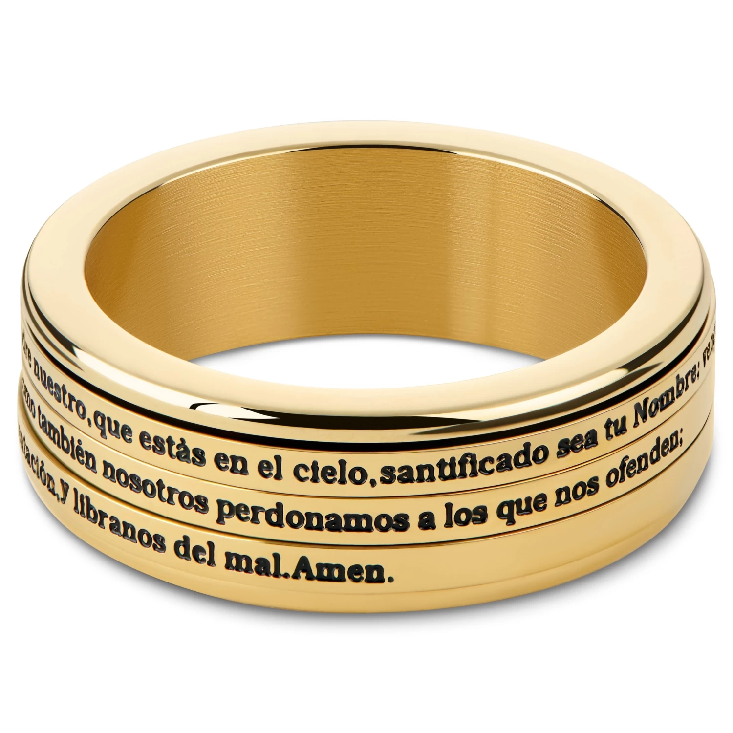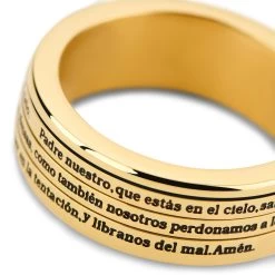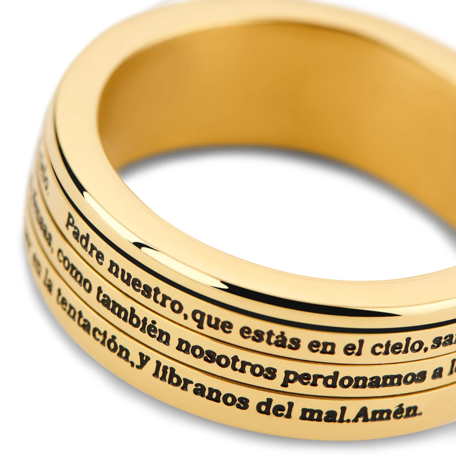 This men’s fidget ring features the Lord’s Prayer in Spanish engraved onto its surgical steel construction. Idly play with the three spinning center bands – something to keep you occupied on long, quiet days.