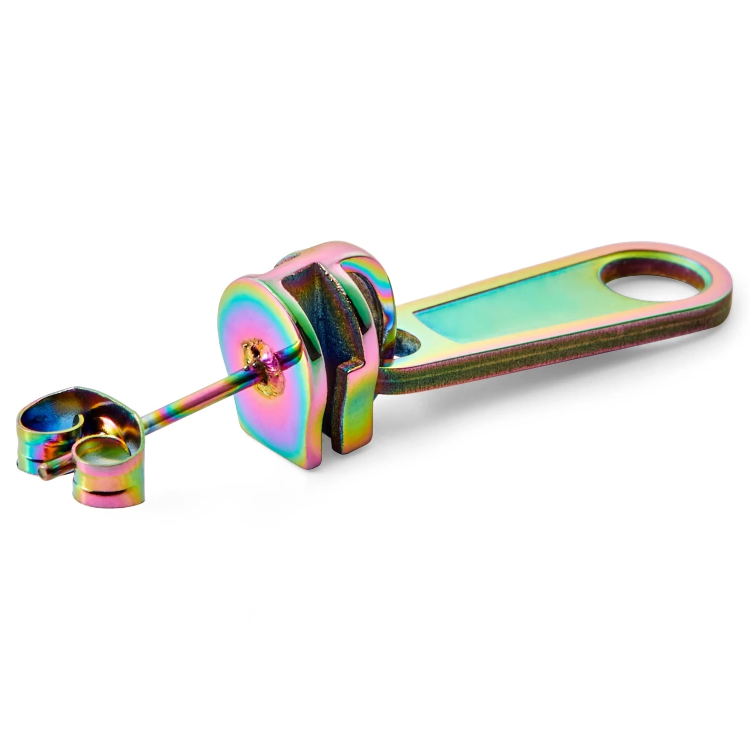 This men’s stud earring is made of surgical-grade stainless steel and held in place by a reliable push back. Coated rainbow for a unique, eye-catching effect. Each piece is slightly different.
