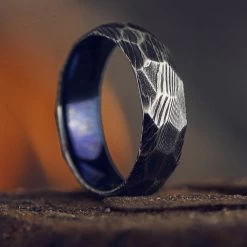 This men’s ring features a faceted outer profile, giving it a rugged vibe that contrasts the organic curves of the Damascus steel. Its curved titanium inner profile is PVD-coated blue. The coating consists of titanium nitride bonded with the metal’s surface at the molecular level and is both scratch and tarnish resistant.