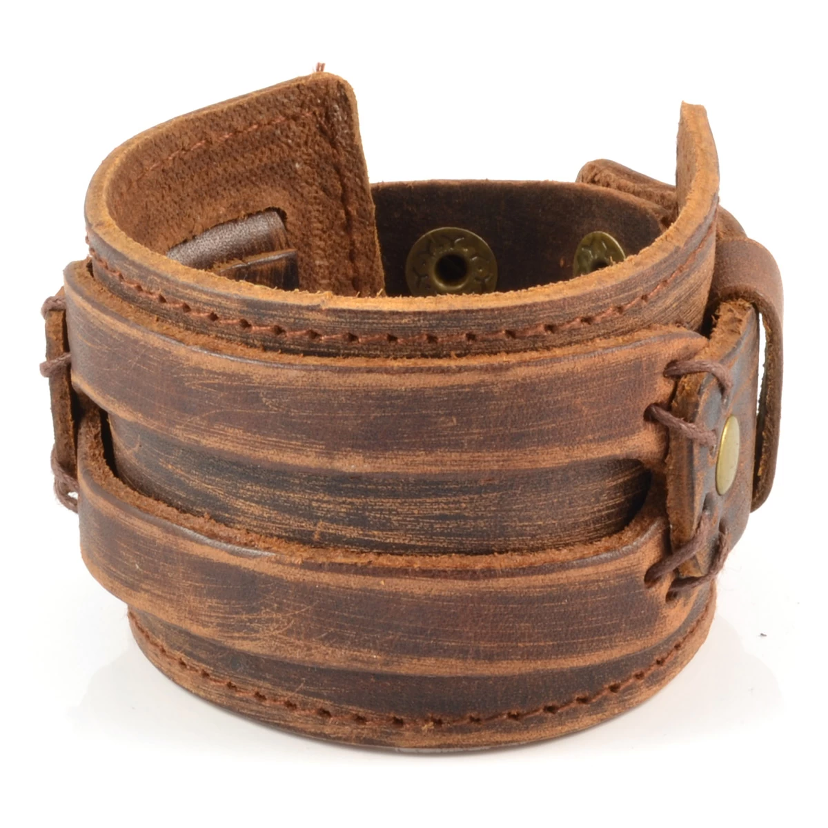 The wide band is surrounded by a thinner one, tied onto the two locking bands. Finished with sleek gold-toned rivets and snap buttons.