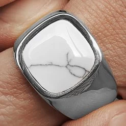 This silver-tone ring boasts a polished finish, square shape, and a white howlite composite stone at its center.