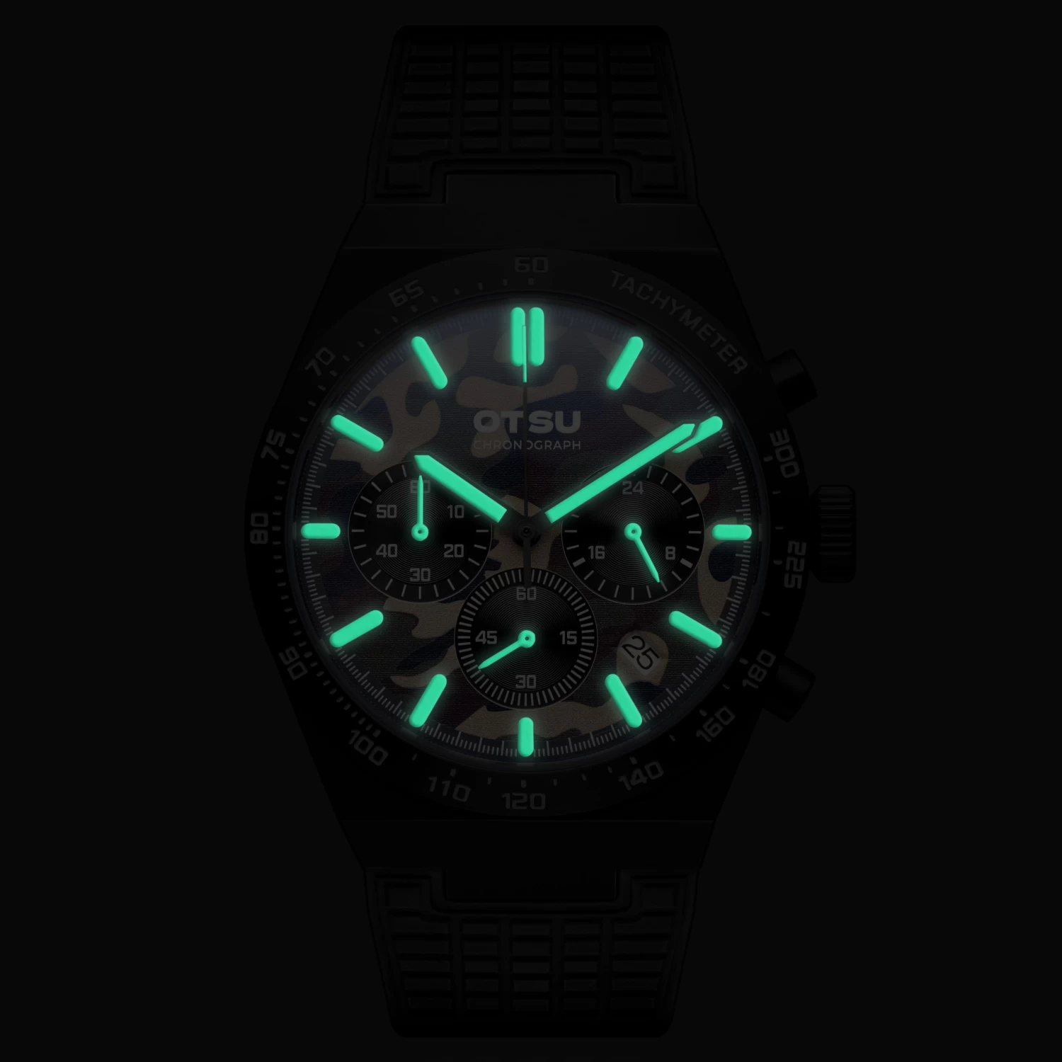 The military-design dial of this men’s watch is protected by a double-domed sapphire crystal – almost as hard as diamond and very difficult to scratch. Easy to read at any hour thanks to its anti-reflective coating and glow-in-the-dark lume.