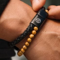 This single men’s bracelet from Lucleon creates a stacked look with Wood Grain Jasper stone beads and braided black leather.