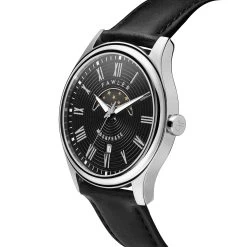 Dauphine hands trace concentric rings on the dial, much like the moon rotates around the earth. A discrete date window lies at 6 o’clock.