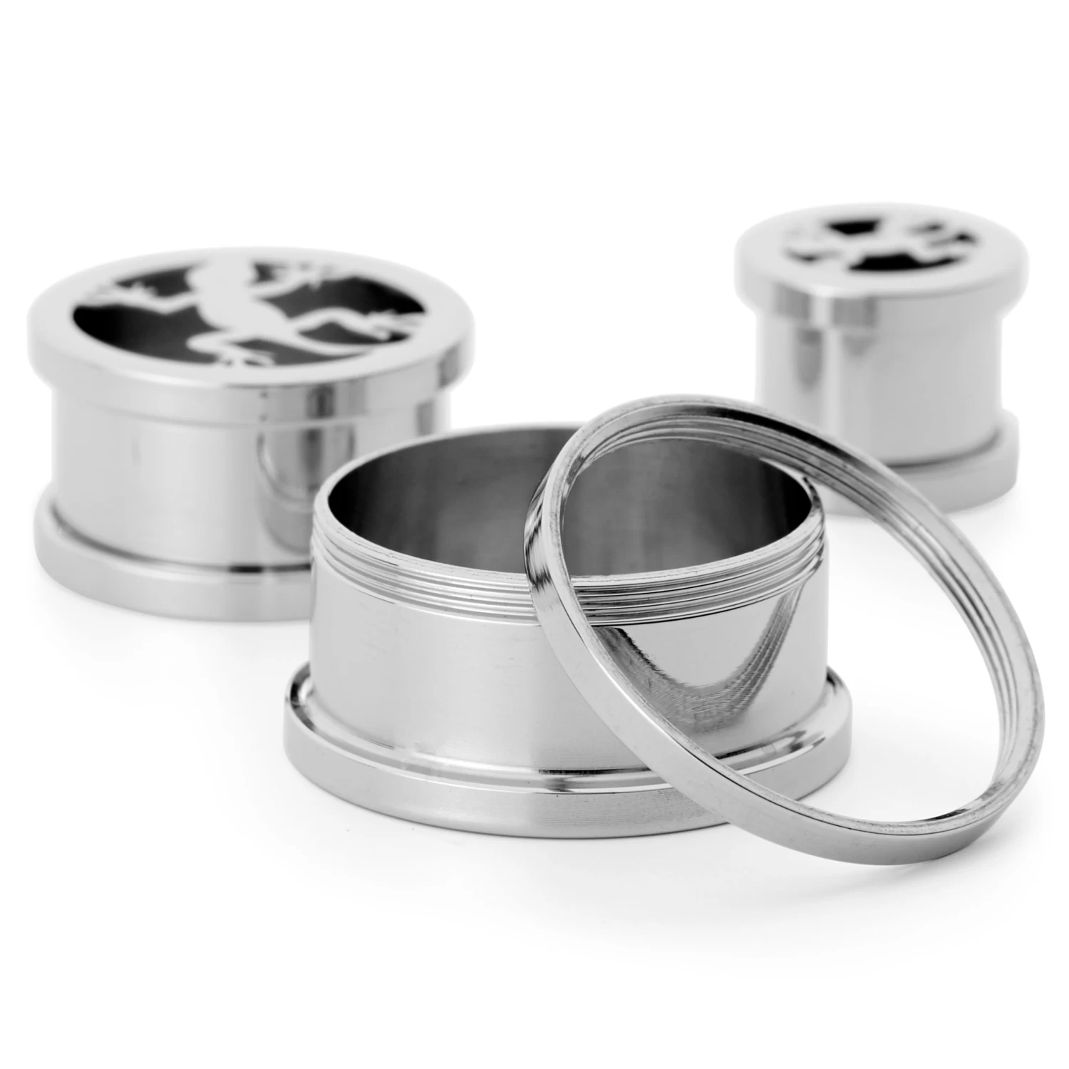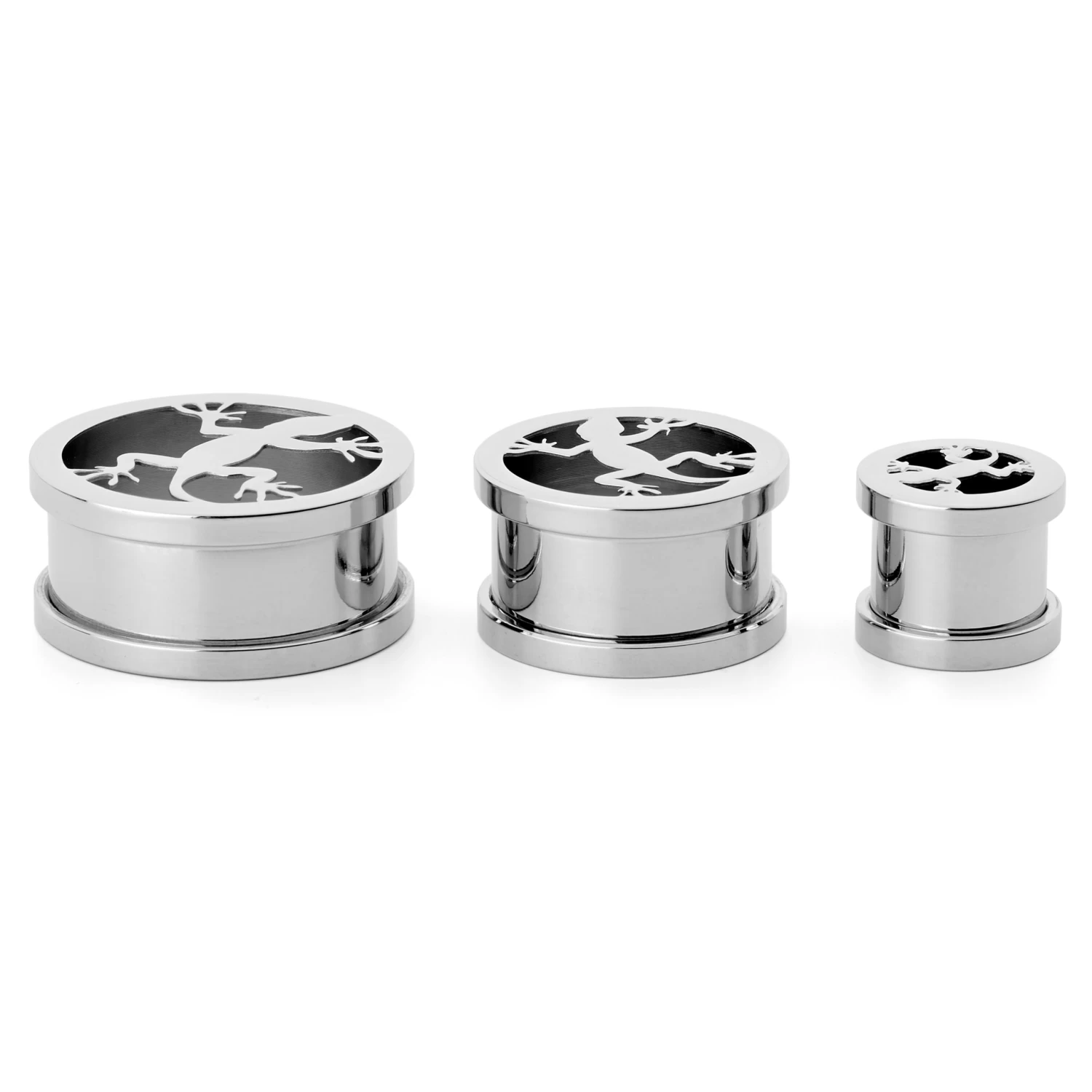 Feel like climbing the wall? Crafted from polished surgical steel, this double flare tunnel is home to a laser-cut lizard design.