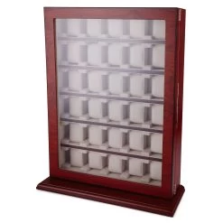 Keep your watch collection safe and in one place with this gorgeous bubinga wood finish cabinet. Holds up to 30 pieces on individual soft velvet pillows. Easy viewing through the large glass front.