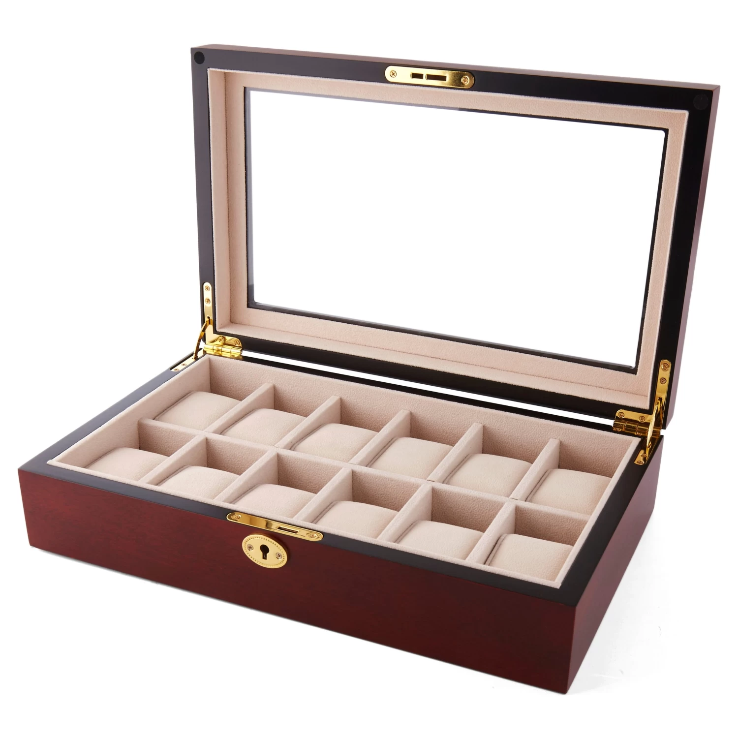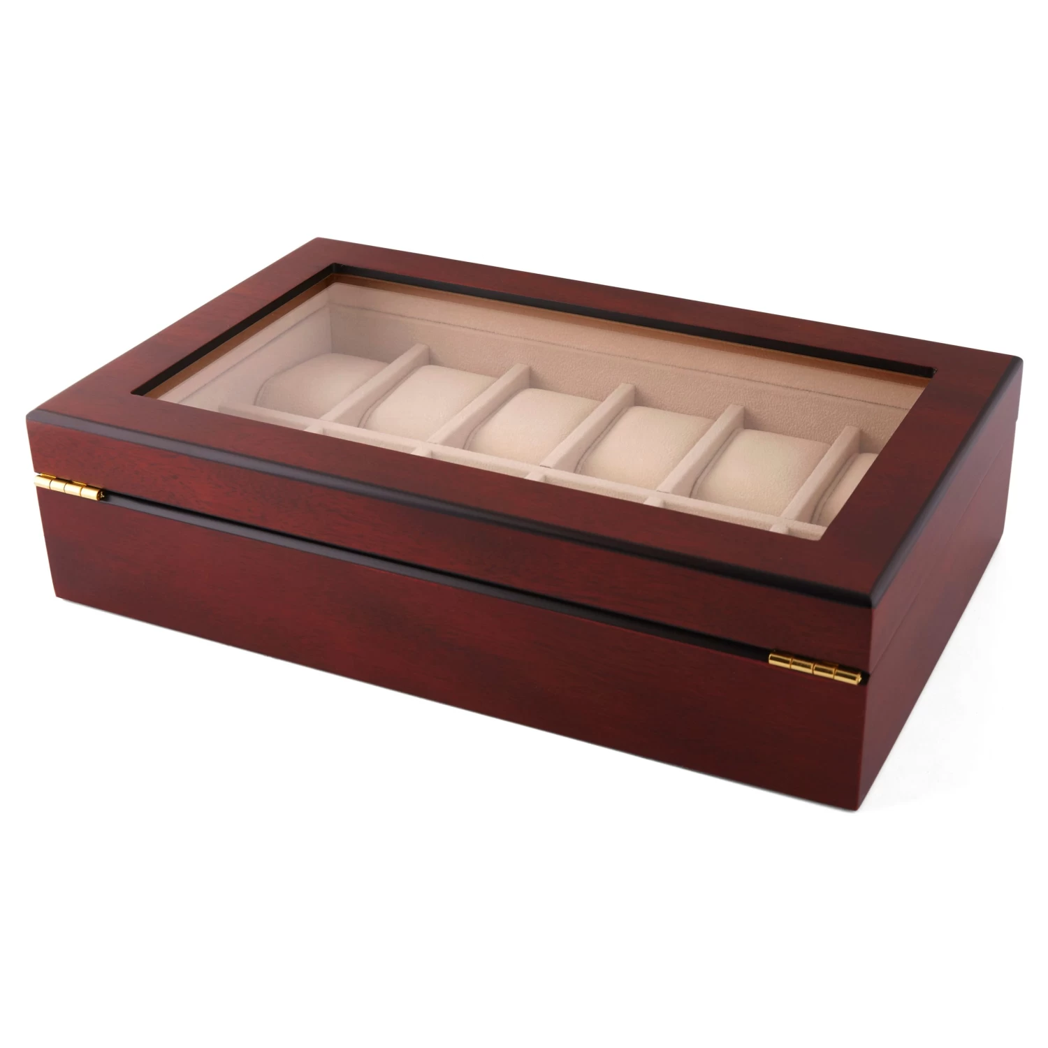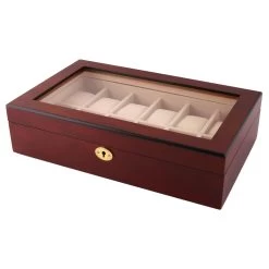 Carefully crafted in a handsome cherry wood finish, this large watch case holds your collection safe and in one place so you’ll always know where your pieces are. Easily view the contents through the clear display pane to choose the day’s companion.
