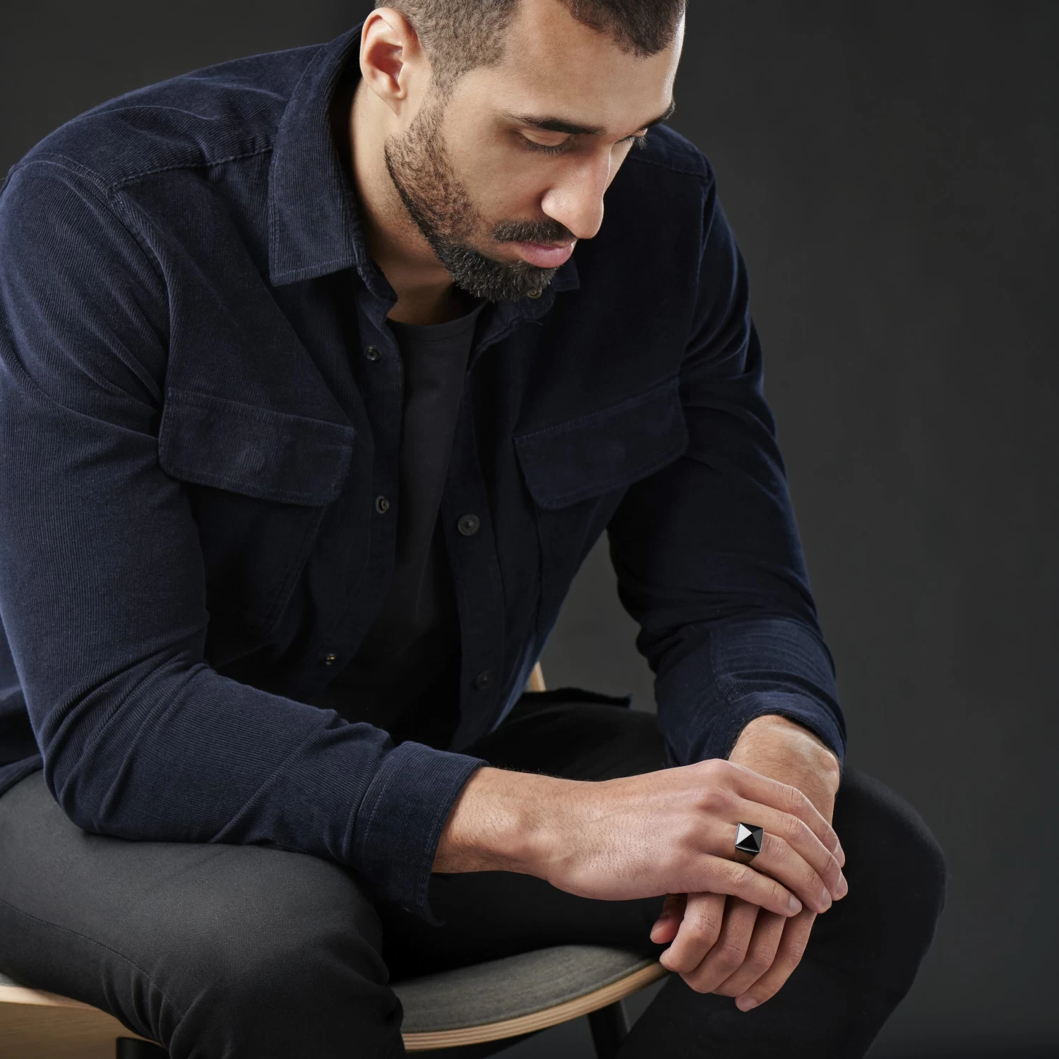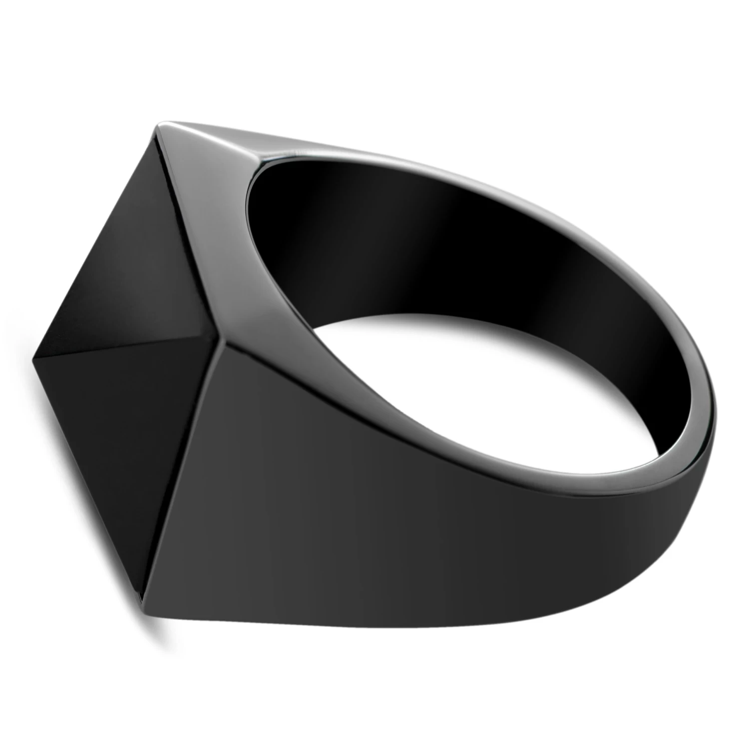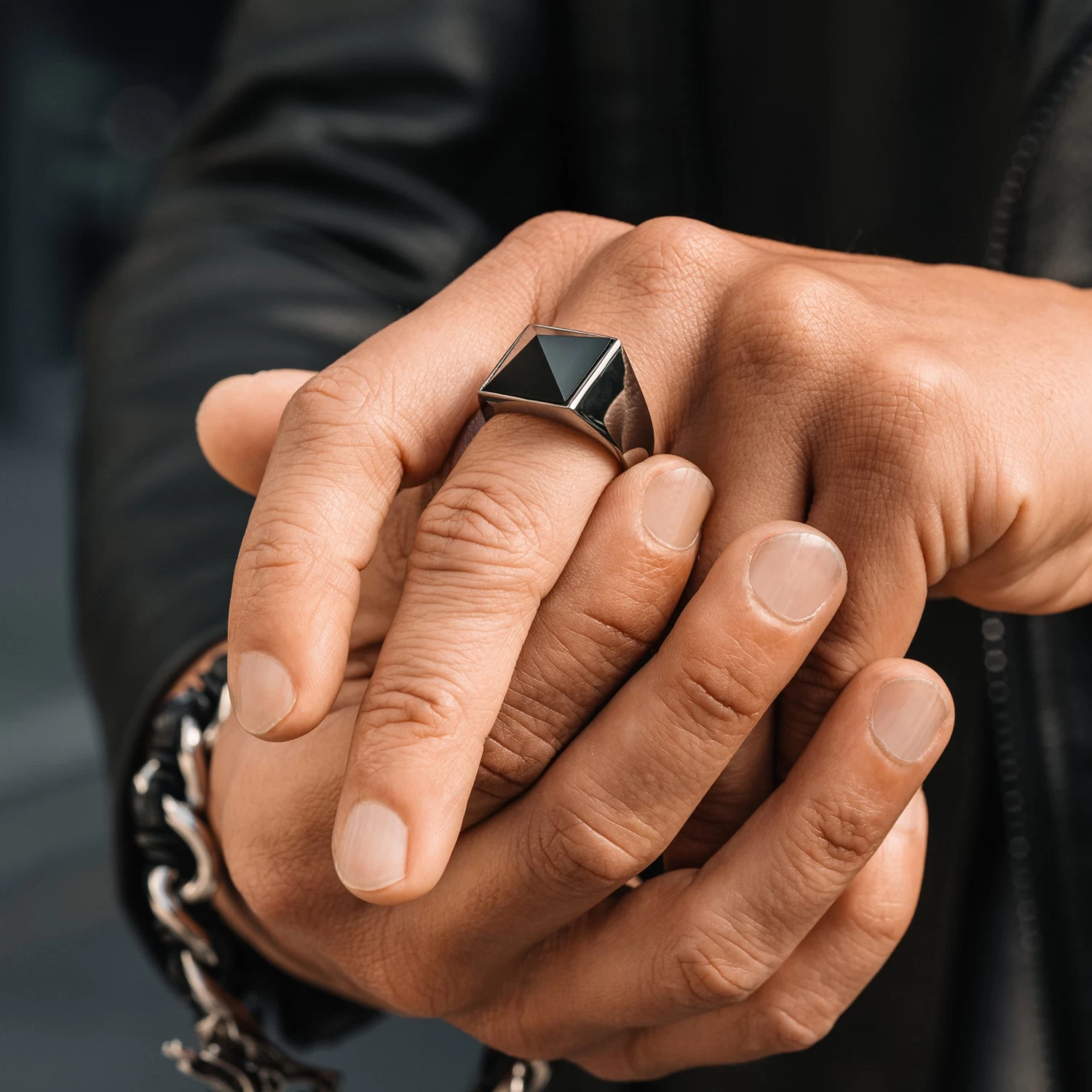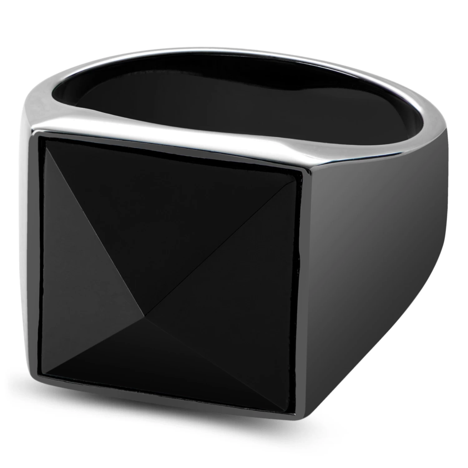 This substantial men’s ring boasts a unique pyramid-shaped top and polished gunmetal-colored stainless steel. A unique upgrade to any look.
