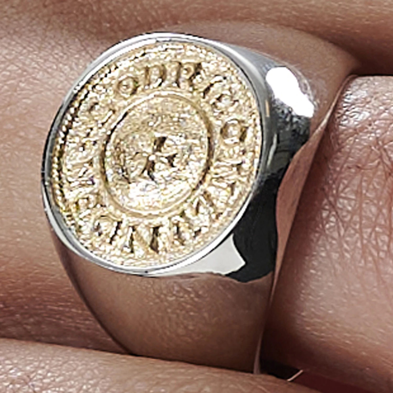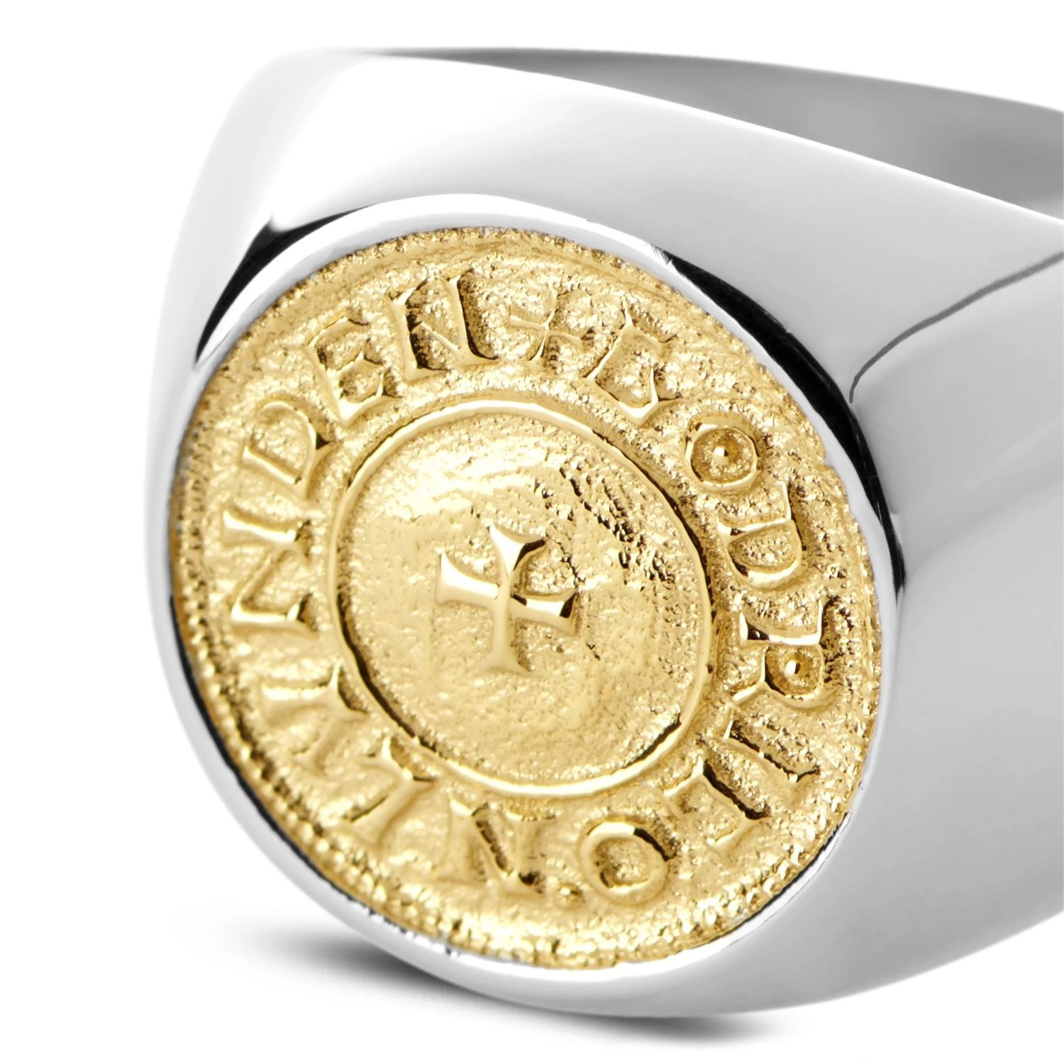 This signet ring bears resemblance to coins used by Vikings in Northumbria. Designed with silver and gold-tone stainless steel and constructed to survive any conquest.