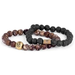 This selection from the Danish brand Lucleon was crafted for their Miro collection. Features matte black and earthy brown beads. Two shiny, gold-toned beads displaying Lucleon’s name and logo are included.