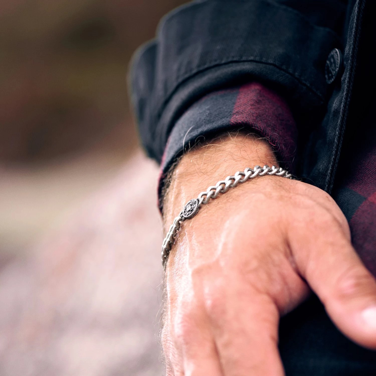 Crafted from durable, high-quality, surgical-grade stainless steel, this men’s bracelet offers an eye-catching aesthetic. Enveloped in an oil-based vintage finish, it exudes rugged charm and distinguished taste.