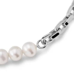 The stainless steel chain complements the elegance of the pearls, adding a touch of sleek, industrial edge.