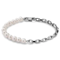 The stainless steel chain complements the elegance of the pearls, adding a touch of sleek, industrial edge.