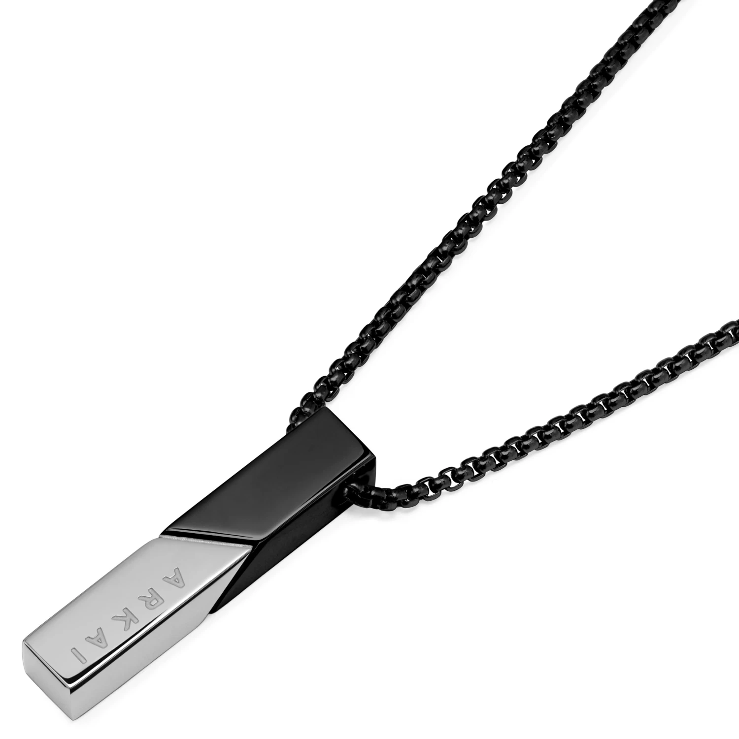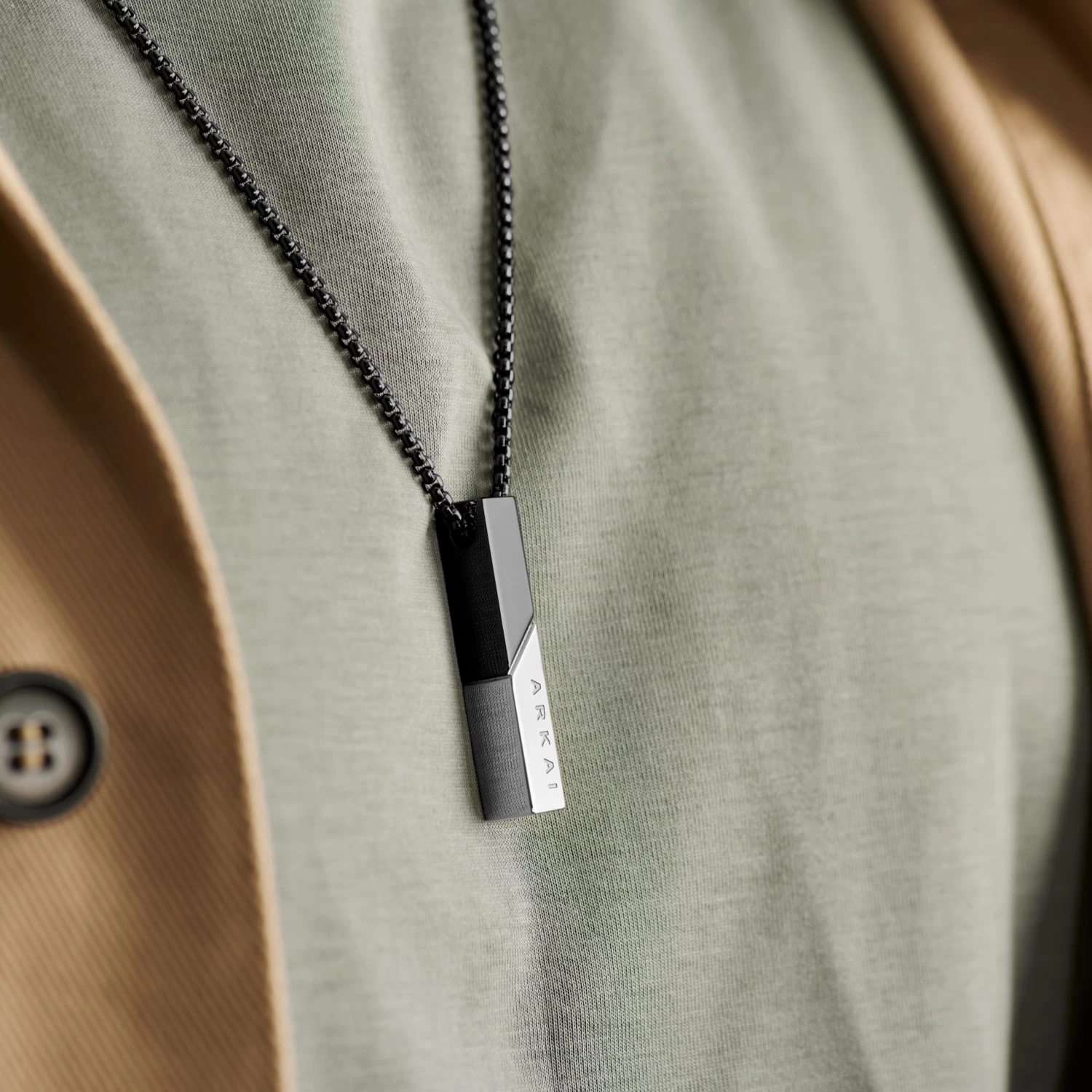 Constructed of double-plated, surgical-grade stainless steel, this solid pendant prominently features ‘ARKAI’ written down its side. That’s how proud we are of its simple, rugged design.
