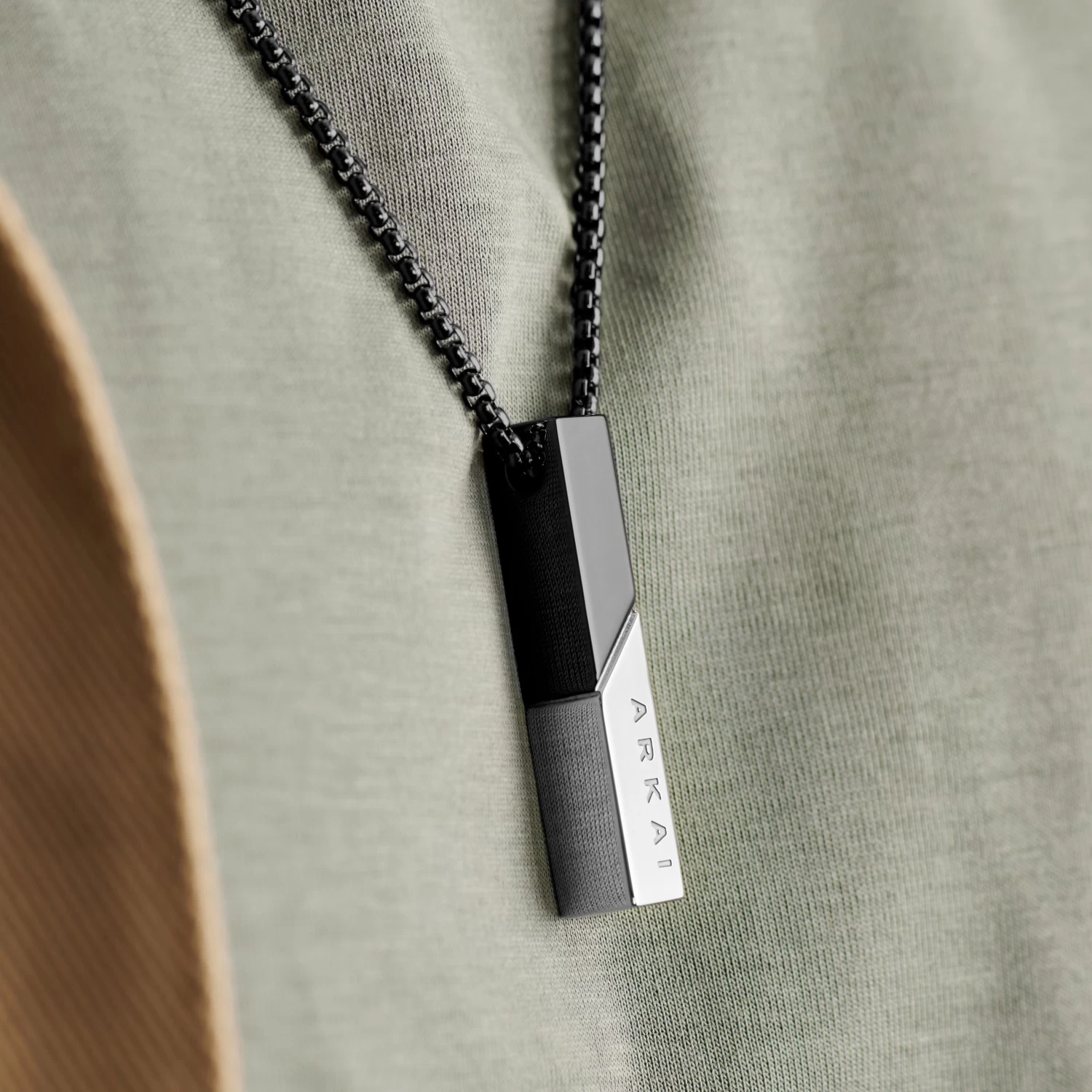 Black goes with everything, and the hanging silver-tone highlight will draw attention to any other silver jewelry you’re wearing. Masculine, clean, solid, angular, and tough. That’s what ARKAI’s Rico Aaron stands for.