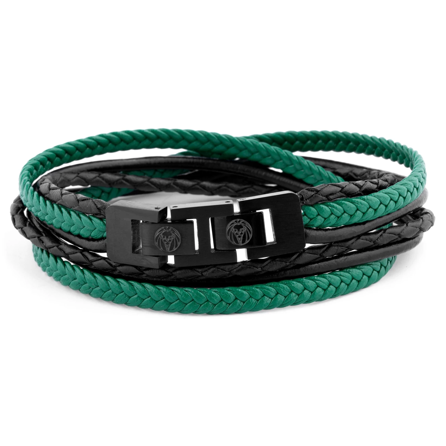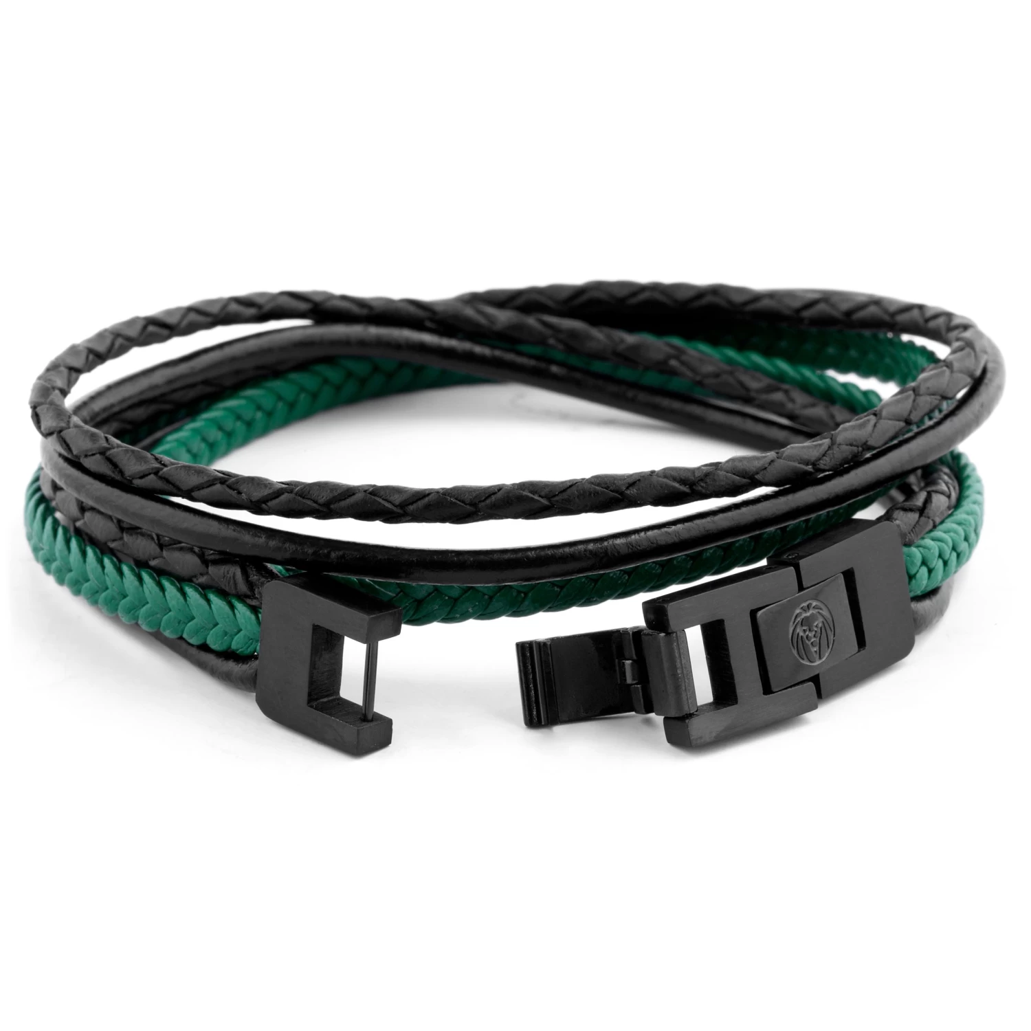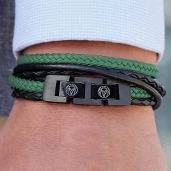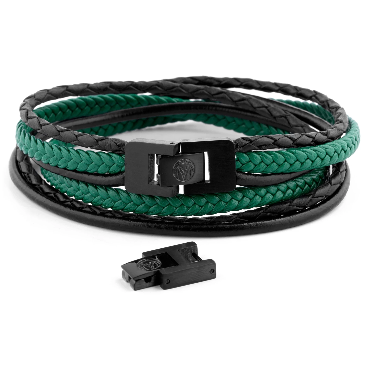 Green strands are braided superfiber, black cords are genuine leather. The black stainless steel lock system features a detachable piece for a closer fit.