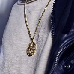 This gold-tone pendant necklace for men is made of surgical-grade stainless steel, and so is the double curb chain on which it hangs. The double chain means that even if a link breaks, the necklace will not fall. I’ll be caught by the next link in the chain. Its durable lobster clasp and adjustable length put you in charge of where the pendant falls.